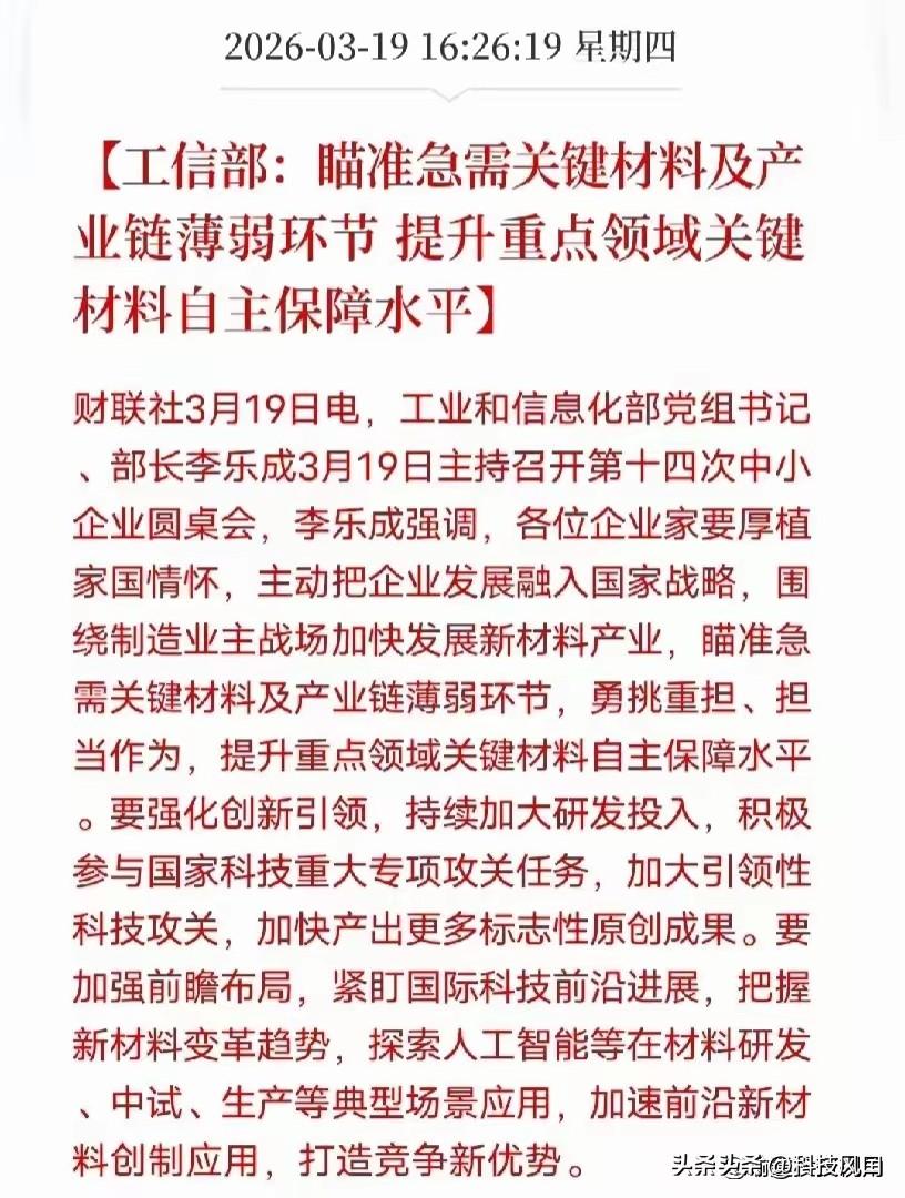 工信部重磅会议定调!关键材料国产替代提速,新一轮投资机会来了 2026年3月19日,工信部召开第十四次中小企业圆桌会,围绕制造业主战场,聚焦先进基础材料、关键战略材料、前沿新材料及“AI+材料”方向,强化研发投入与创新攻关,补齐产业链短板,推动上下游协同创新,培育新材料领域优质中小企业。 一、半导体材料(国产替代) 1、光刻胶/湿电子化学品:彤程新材、晶瑞电材、南大光电、上海新阳、鼎龙股份、容大感光 2、电子特气:华特气体、雅克科技、金宏气体 3、CMP抛光材料:鼎龙股份、安集科技 4、大硅片/靶材:沪硅产业、立昂微、江丰电子、有研新材、有研硅 5、第三代半导体/石英:天岳先进、石英股份 二、军工及高端装备材料(战略刚需) 1、高温合金/钛合金:西部超导、抚顺特钢、图南股份、钢研高纳、宝钛股份 2、碳纤维及复合材料:中简科技、中复神鹰、光威复材、楚江新材 3、特种功能材料:菲利华、贵研铂业、广信材料 4、PEEK/特种工程塑料:中研股份、新瀚新材、沃特股份 5、高端铜合金/航天金属:斯瑞新材 6、航天精密结构件:超捷股份、铂力特 三、AI+新材料(新兴成长) 1、平台型/数字化材料企业:国瓷材料、有研粉材、铂力特 2、AI散热/金刚石:中兵红箭 短期弹性:半导体材料中技术突破明确标的、AI+新材料主题标的,受政策催化更易获资金关注。 长期确定性:军工及高端装备材料、半导体核心环节材料、PEEK特种塑料,需求刚性且国产替代空间大。 风险提示:政策为长期逻辑,短期股价受市场情绪、基本面影响;AI+材料需警惕主题炒作风险。 新材料 半导体 军工