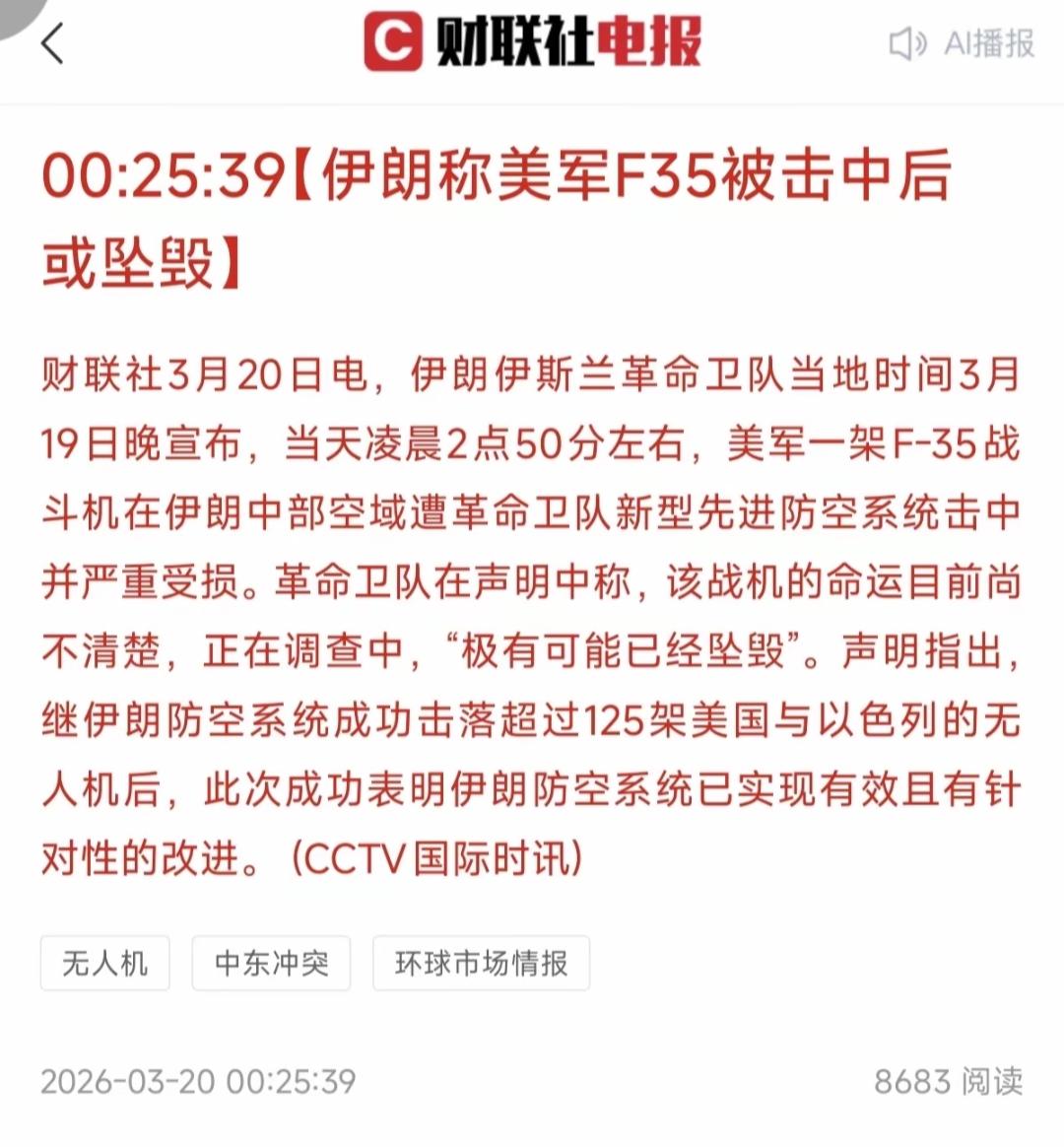 伊朗声称在19日凌晨,伊朗的防空系统击中了一架F-35战斗机,很大可能已经坠毁。 伊朗要是真的把F-35战斗机击中并且坠毁,那真的是非常的厉害了。因为这些年来虽然很多国家都说击毁了F-35战斗机,但是都没有真正的证据证明它被击中坠毁。 F‑35是最先进的多用途/三军通用隐身战机,虽然不是美国整体最先进的战斗机,但是却是美国列装前二的战斗机,性能方面还是很出色的,想要被击中坠毁,还是有一定难度的。