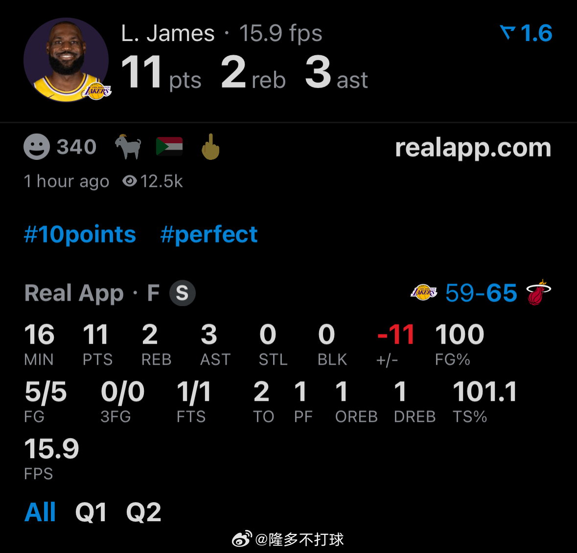 5投5中,11分2失误,正负值-11全队最低如何评价詹姆斯上半场的表现?湖人vs