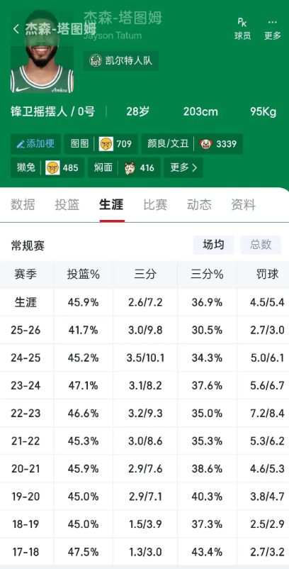 一直以为东契奇生涯命中率48%以上。我一看,这也太离谱了,怎么回事儿。为啥喷塔图姆就是效率低。东契奇就是超神。就连塔图姆被诟病的瞎扔三分,命中率都比各种神仙球的东契奇高。