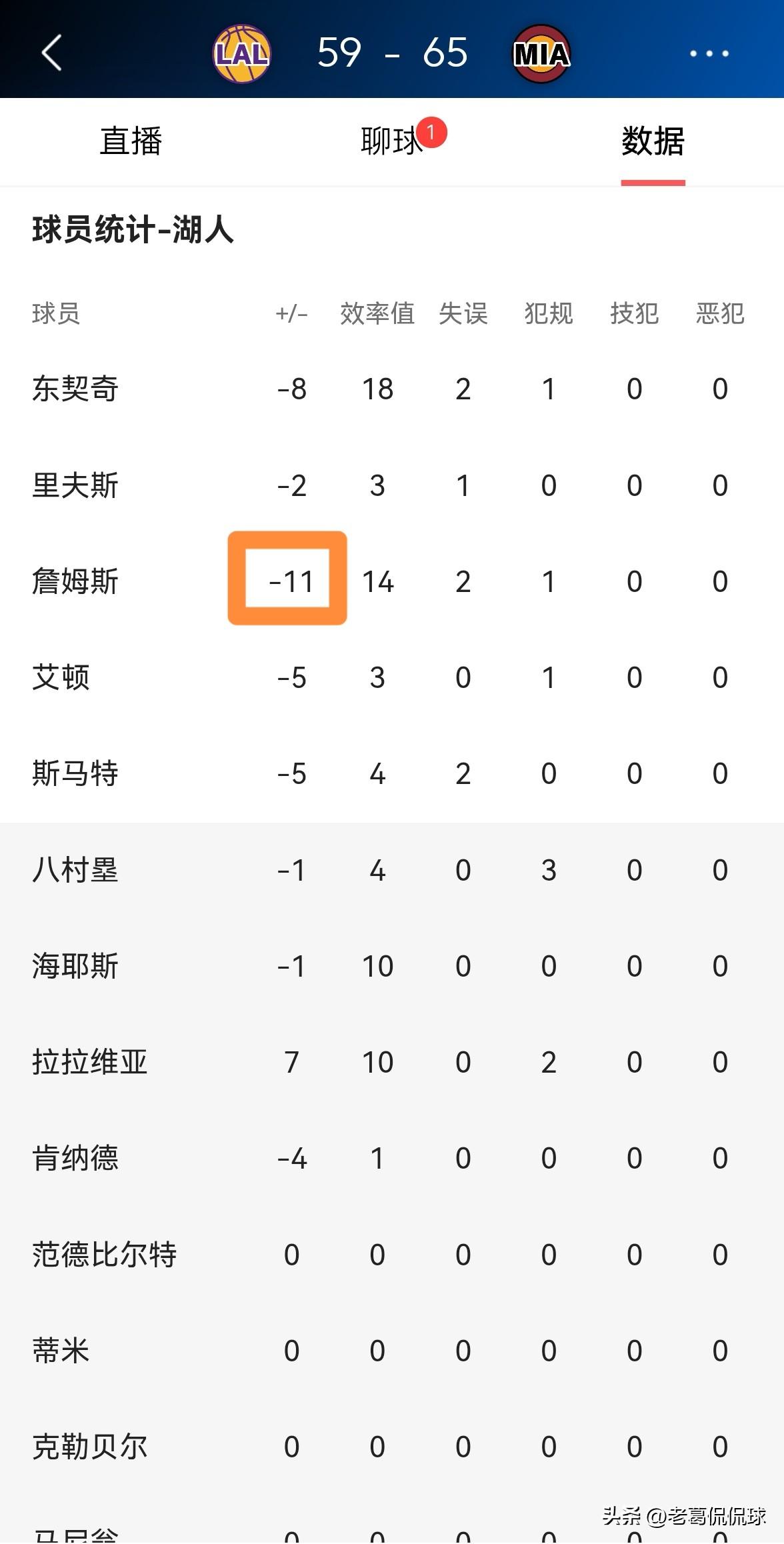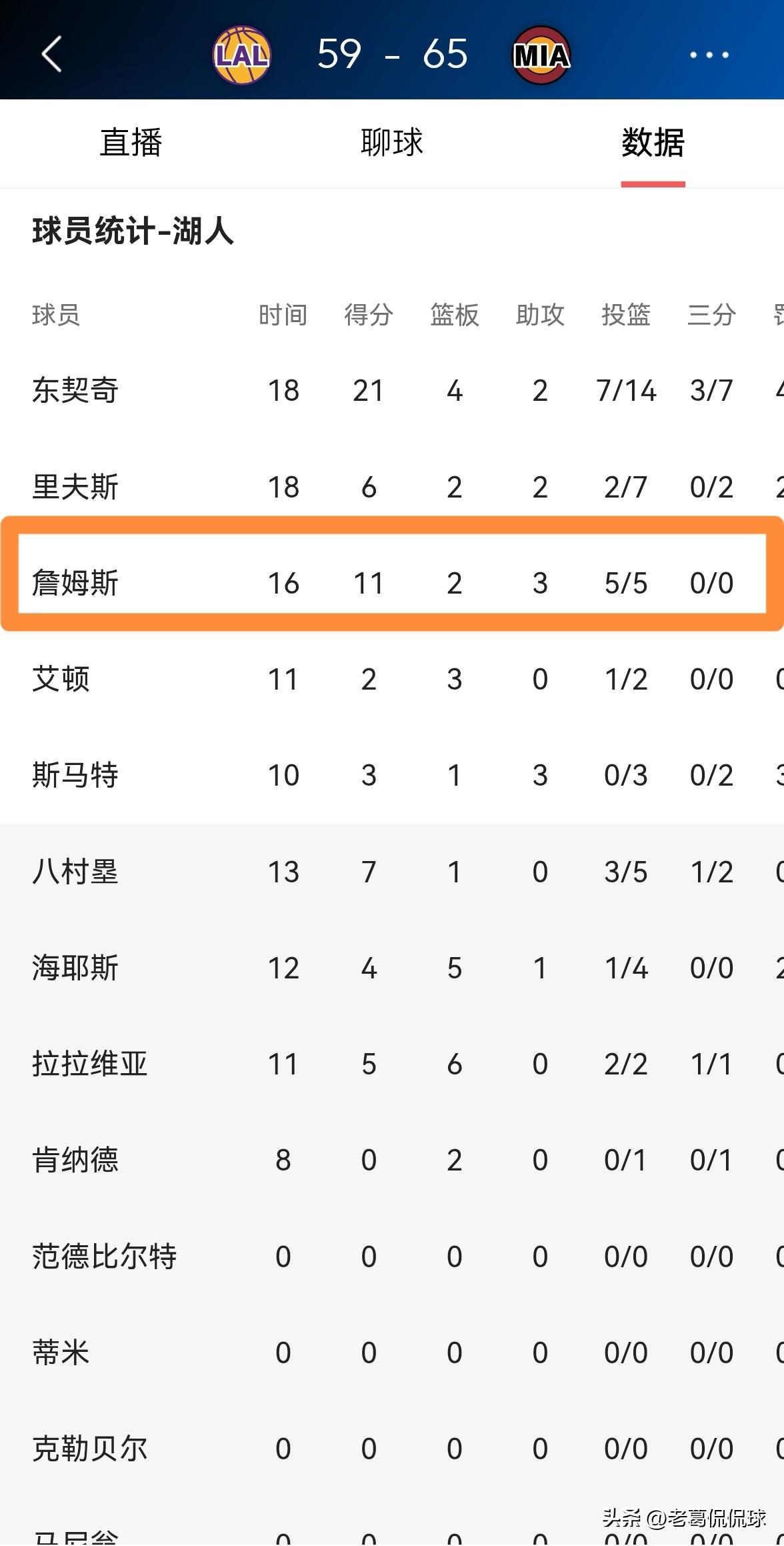 湖人超级球星詹姆斯真是太过分了!在今天湖人客场挑战热火的比赛中,目前双方半场战罢,湖人以59:65落后于对手。让人感到不可思议的是,在前两节比赛中,詹姆斯延续了昨天打火箭时的无敌手感,他在首发出战的16分钟里,投篮5中5,其中罚球1中1极其高效的砍下11分,还有2篮板3助攻,不过詹姆斯的场上正负值为全队最低的-11。 作为一名41岁的老将,詹姆斯竟然连续两场比赛保持如此火热的进攻状态,你们说老詹是不是太过分了?