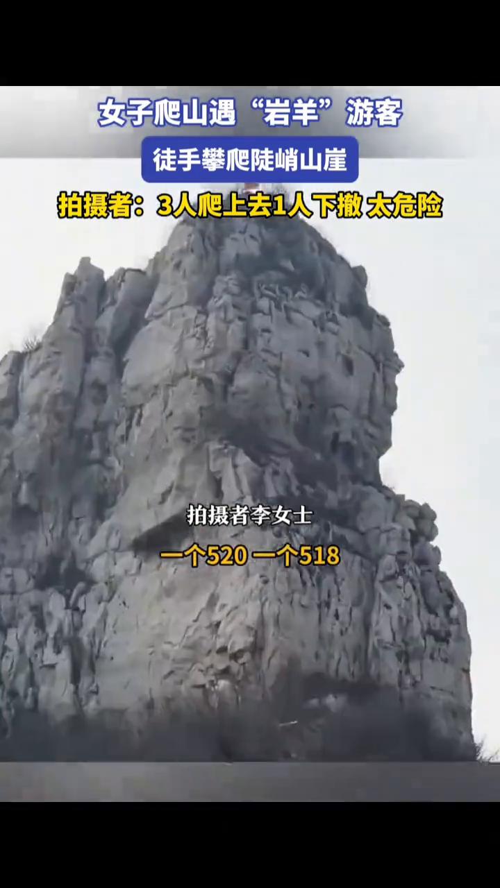 女子爬山遇"岩羊"游客,徒手攀爬陡峭山崖。 拍摄者李女士。 3月19日(发布日期),河北石家庄。我跟姐妹去爬山,发现他们是徒手(攀爬)。(后续)我们看到的是有3个人上去了,有1个人中途下撒了。它有两个山头,一个520,一个518。爬的是518,建议不要徒手攀岩攀爬,太危险了(地方)挺陡的。