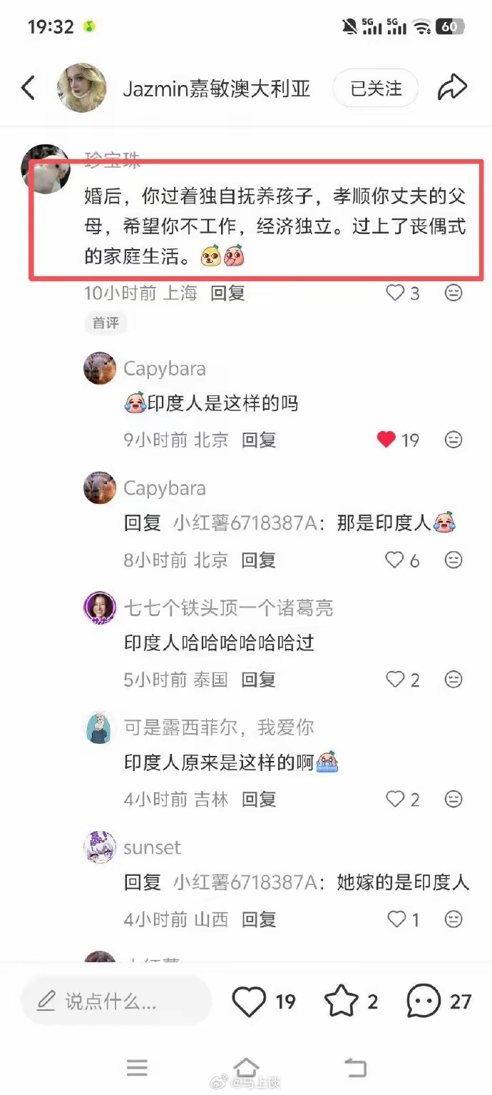 一女子阴阳怪气澳大利亚女网友晒的中国男友,结果网友打开她的主页,发现她竟嫁了一个印度人,纷纷嘲笑她的丧偶式生活…