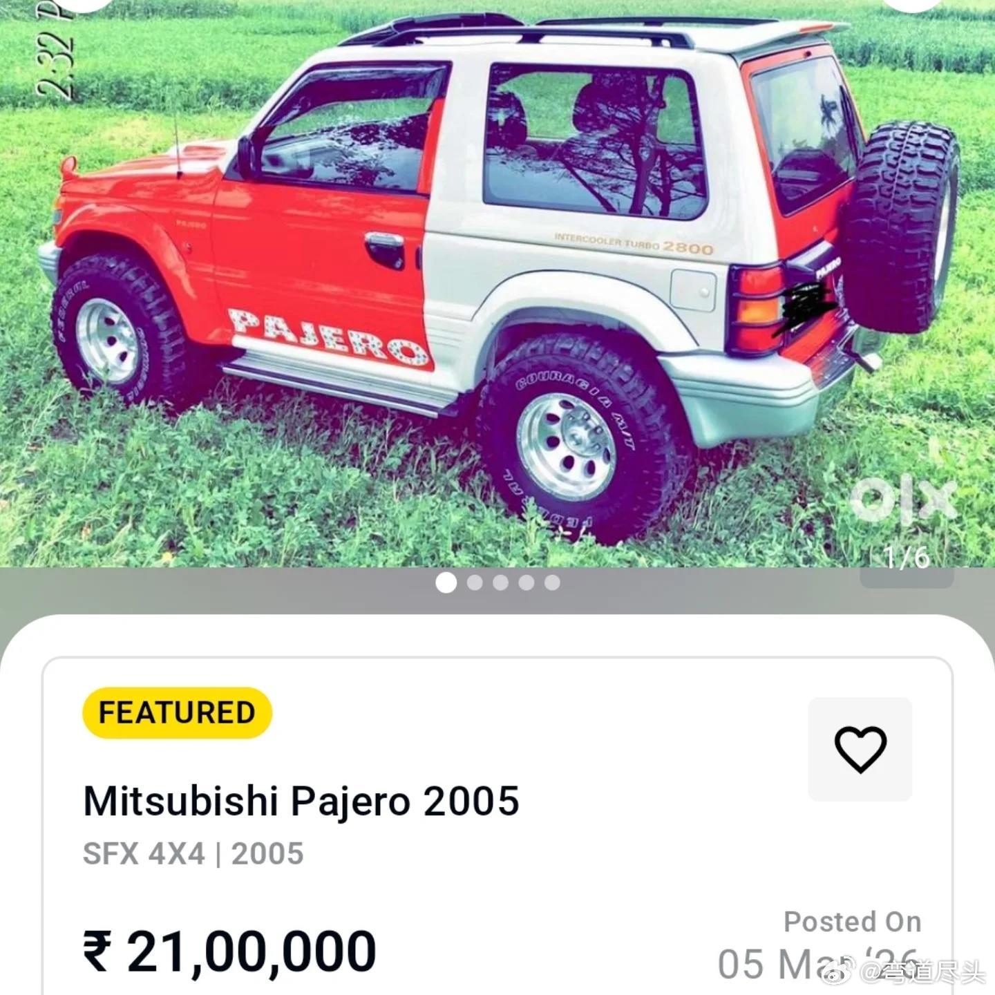 帕杰罗 稀有三菱帕杰罗短轴版出售信息(印度OLX平台),首见短轴版SFX印度专属双色涂装。车型:三菱帕杰罗二代Pajero SFX 4X4 两门版价格:210万印度卢比(INR)≈ 15.5万元人民币(CNY)年份:2005款动力/变速箱:柴油版 手动挡行驶里程:10万公里车辆权属:第三任车主行驶证有效期:至2031年车辆特点:稀有小众硬派小型四驱,适合越野爱好者收藏/使用。油价疯涨正在击碎打工人的穷游梦