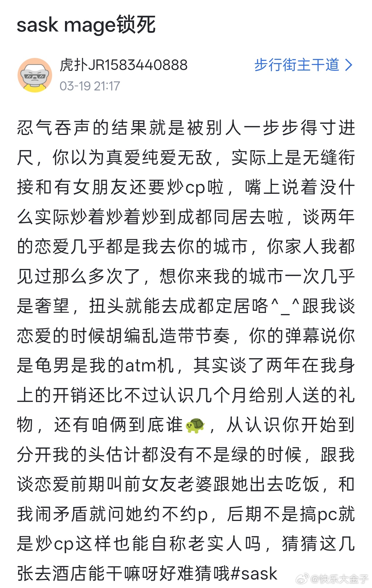 Sask前女友长文+聊天记录,重锤恋爱期间被pua、断崖式分手。大概分了三大部分: