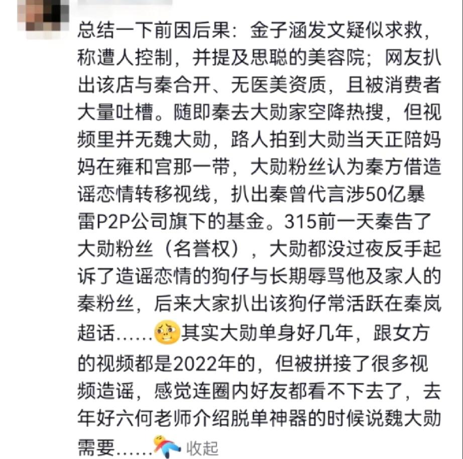 秦岚和王思聪投资的医美医院爆雷了! 这家机构只有基础生活美容资质,根本没有医疗注射资质,却违规超范围经营少女针等项目,导致很多消费者注射后烂脸、肿胀、毁容,现在已经被监管立案调查。 秦岚这件事刚有点热度,就被爆出和魏大勋的恋情热搜,什么魏大勋求婚、两人同进一个小区,全是用来转移注意力的。其实爆料的全是旧料,两人据说早就已经分手了。 现在秦岚和魏大勋都在互告,秦岚起诉魏大勋的粉丝,魏大勋也起诉造谣恋情的狗仔和秦岚粉丝,双方粉丝吵得不可开交。