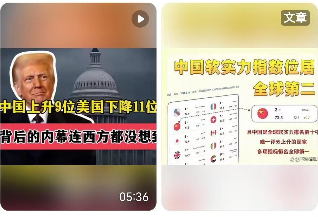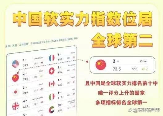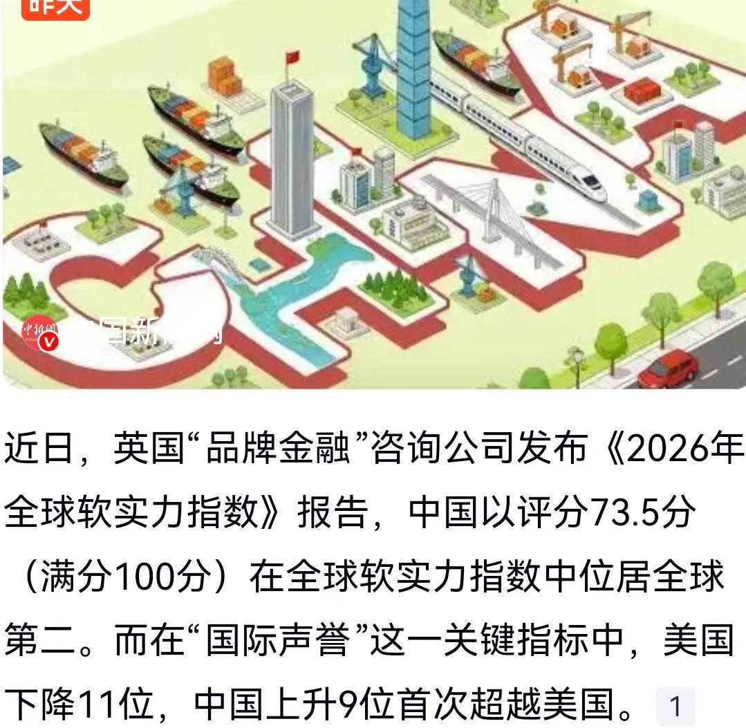近日,国际舆论场上一份重磅报告引发了不小的震动。英国著名的“品牌金融”咨询公司发布了《2026年全球软实力指数》报告,数据直截了当:中国以73.5分(满分100分)的成绩,位列全球软实力指数榜眼,稳坐全球第二把交椅。更耐人寻味的是,在“国际声誉”这一核心指标上,剧情出现了戏剧性的反转——中国排名攀升9位,而美国则大幅下滑11位,中国首次在这一维度上完成了对美国的超越。 这一升一降之间,绝非简单的数字游戏,它折射出的是全球地缘政治版图中,人心向背的微妙变迁。 这份出自英国“品牌金融”咨询公司的报告,在国际品牌估值领域向来有着极高的权威性。他们的评估模型并非空中楼阁,而是基于对全球超过100个国家的10万多份问卷访谈,涵盖了熟悉度、影响力、声誉等几大维度,并细分为商业与贸易、文化与传统、治理、国际关系等七大支柱。中国拿下73.5的高分,并在综合排名中稳居第二,这说明国际社会对中国的认知,正在从单一的经济大国,向全方位的强国形象转变。 让我们把目光聚焦到那个最受关注的“国际声誉”指标。声誉,是一个国家软实力的“晴雨表”。中国上升9位,这背后是实打实的“口碑逆袭”。 过去,西方话语权一统天下,中国的发展往往伴随着杂音。但近年来,无论是“一带一路”倡议在沿线国家留下的基建红利,还是中国在新能源汽车、高铁技术、航天科技等硬核领域的突破,都在不断刷新世界的认知。这种认知的改变,不再是基于宣传口号,而是基于看得见、摸得着的合作成果。当东南亚的民众坐上了时速350公里的雅万高铁,当拉美国家用上了中国企业的光伏电力,这种由硬实力溢出而带来的软实力认同,显得尤为坚实。评论区内有网友调侃:“SHE中国话的歌词含金量还在提升。”这句玩笑话,恰恰击中了文化输出软肋。多年前流行的歌词“全世界都在学中国话”,如今已成为全球数千万孔子学院学员、跨境电商从业者、以及中国游(China Travel)热潮中外国游客的真实写照。 反观美国,下降11位的成绩单可谓“烫手”。作为长期占据榜首的超级大国,美国在“国际声誉”上的失分,与其近年来的外交表现息息相关。从频繁的“退群”毁约,到对他国内政的干涉,再到美元武器化的操作,美国正在透支其二战以来积累的信用资产。评论区里那句“美元与美军只要垮一个,基本就大局已定”,话糙理不糙,一语道破了美国软实力的根基逻辑。长期以来,美国的软实力很大程度上是依托于美元霸权和军事霸权构建的“光环”。当这种硬实力被滥用,导致全球地缘动荡、经济风险外溢时,原本附着其上的文化吸引力自然会随之剥落。好莱坞电影和常春藤高校依然强大,但在国家信誉这一“底色”褪色后,单纯的“文化滤镜”已难以掩盖现实的裂痕。 我们需要客观看待这份《2026年全球软实力指数》报告。虽然中国在“国际声誉”上实现了对美的历史性超越,且综合指数稳居第二,但这并不意味着我们可以高枕无忧。在软实力的诸多细分领域,如全球文化传播的深度、国际话语权的主导性、以及全球品牌的溢价能力上,中国与顶尖强国之间仍存在博弈空间。美国此次虽然声誉下滑,但其综合软实力底蕴依然深厚,在创新、教育、媒体传播等领域的存量优势依然明显。 这场排名的“大反转”,其实是国际社会心态变化的一个缩影。世界正在变得多极化,发展中国家和“全球南方”国家的声音不再被边缘化。中国声誉的提升,本质上是国际社会对“合作共赢”发展模式的认可,是对“和而不同”价值观的接纳。相比于单边主义的霸权逻辑,越来越多的国家愿意看到一个稳定、繁荣、愿意承担国际责任的中国。 对于普通人来说,这份报告也提供了极具价值的视角。它告诉我们,国家的形象不再是虚无缥缈的概念,它关乎每一个走出去的中国企业、每一位出境旅游的国人、每一件流向世界的“中国智造”。软实力的每一次提升,都是国家综合实力在人心中的投影。 排名的变动只是表象,背后的真相是:世界对中国的期待变了,中国对世界的贡献也实实在在变了。在这个充满不确定性的时代,信誉就是最大的确定性。中国用73.5分和9个位次的攀升证明,脚踏实地搞建设、心平气和搞合作,远比挥舞大棒更能赢得世界的尊重。未来的路还长,但这步“关键超越”,无疑是具有里程碑意义的一步。 以上内容仅供参考和借鉴