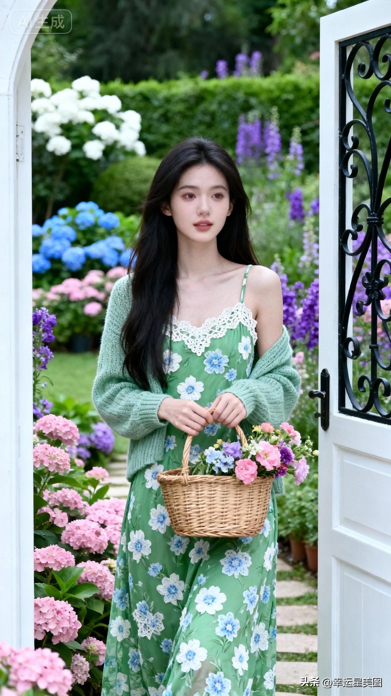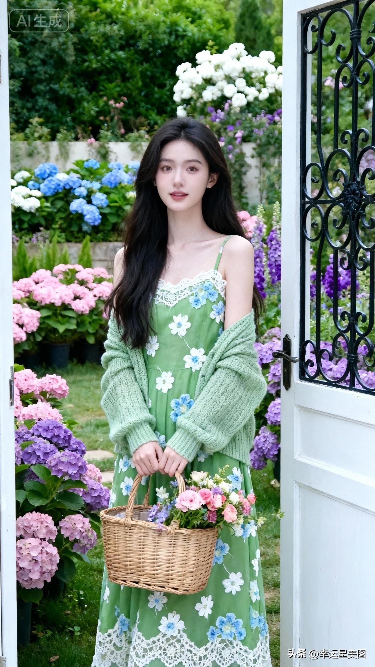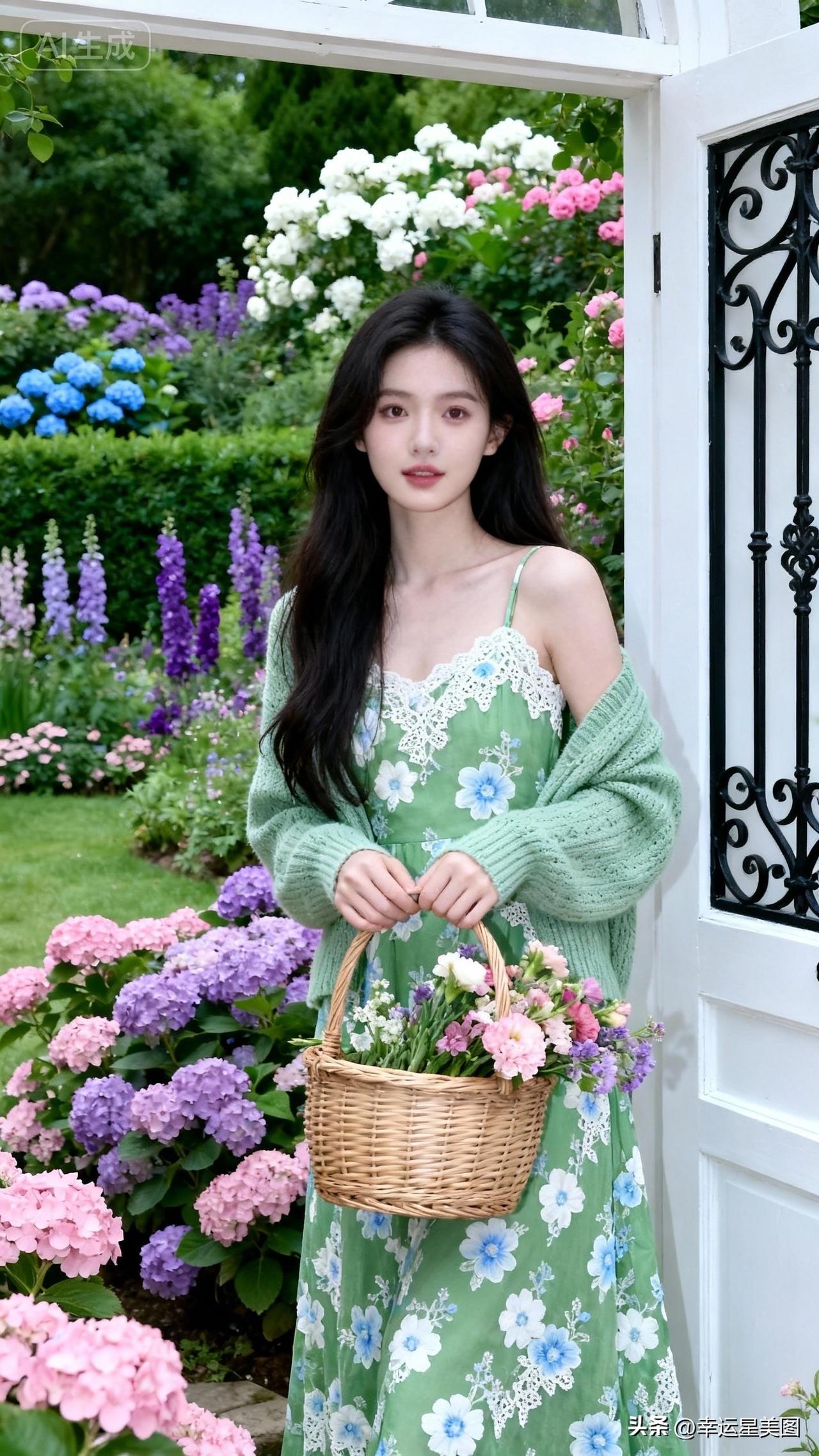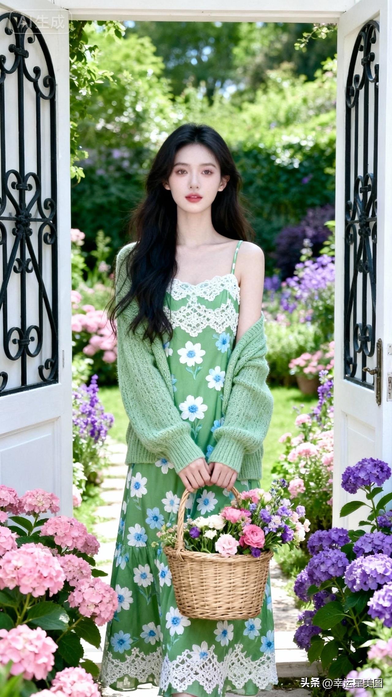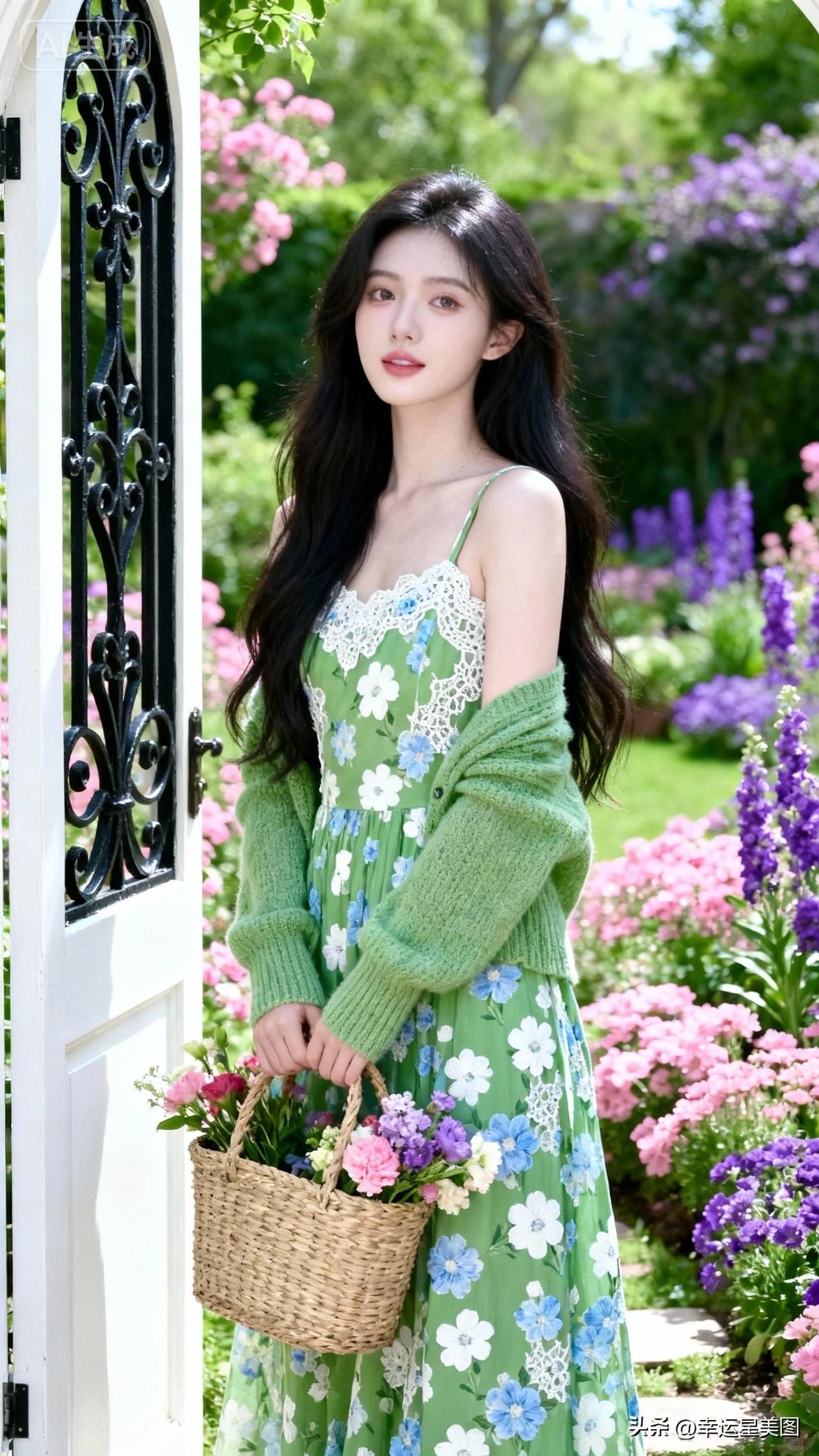 春日花海中的少女,手捧花篮,清新自然。