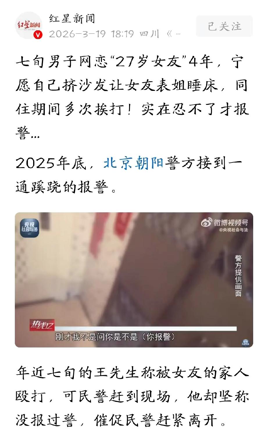北京,70岁大爷在网上认识了一个27岁女友,两人交往4年,给她花了二十来万,但一面都没见过,大爷要跟她视频,她以自己在国外搞科研,内容涉密为由拒绝。后来,女友表姐受伤,住进了大爷家,大爷把床让给她,自己在沙发上对付了大半年。本以为能赢得女友芳心,可表姐脾气暴躁,稍不顺心就把他打得鼻青脸肿。大爷忍无可忍,选择报警。万万没想到,警方一查,背后的真相让大爷目瞪口呆,破口大骂。 2025年底,朝阳警方接到一通奇怪的报警电话,电话里一个老爷子声音发抖,说自己被打了,而打他的,是女朋友的家里人。 可等民警火急火燎赶到现场,敲开门一看,老爷子愣在那儿,眼神躲闪,连声说“没报过警,没这回事”,还一个劲儿的催着民警赶紧走。 这老爷子姓王,快七十岁了,屋里还站着一个中年妇女,五十出头的样子,王大爷介绍说,这是女朋友的姐姐,借住在这儿。 民警瞅着不对劲,老头儿脸上有伤,眼神飘忽,说话前后矛盾,这里面肯定有事儿。 再三追问下,王大爷终于绷不住了,蹲在墙角,把脸埋进手里,把事情原原本本倒了出来。 原来四年前,王大爷在网上认识了一个女孩,叫李梦,头像是个清秀的姑娘,资料写27岁。 李梦说自己搞极地科研的,常年在国外,工作涉密,不方便视频,连语音都很少打。 但文字聊天特别热乎,一口一个“哥哥”,嘘寒问暖,把王大爷这颗孤单了几年的心,捂得滚烫。 两人交了四年,王大爷愣是没见过她一面,但心里已经认定李梦,把她当成了后半辈子的依靠。 逢年过节,李梦说单位要送礼、同事要随份子、家里有急事,王大爷二话不说就转账,这些年,前前后后转出去十几万。 半年前,李梦突然说,表姐石某脚受伤了,在北京有别墅,但她一个人住没人照顾,能不能去王大爷那儿借住一阵子。 王大爷想都没想就答应了,收拾出家里唯一一张床,让给表姐睡,自己就在客厅沙发上对付了半年多。 本以为和未来亲戚好好相处,能有效拉进饿和女友的距离,谁知表姐一住进来,王大爷的日子就难过了。 这女人脾气暴,稍有不顺心就骂人,骂急了还动手。 王大爷这把年纪,哪经得住打,挨了打,他也不敢吭声,怕得罪了表姐,传到李梦耳朵里,女朋友跑了咋办? 他就这么忍着,挨了一回又一回的打,实在忍无可忍了,才偷偷摸摸报了警。 可警车一来,他又怂了,想着家丑不可外扬,想着万一李梦知道了生气,就赶紧把民警往外推。 民警听完,心里差不多有数了。顺着转账记录一查,李梦收钱的账户,开户人竟然就是这位“表姐”石某。 哪有什么27岁的女科学家,哪有什么脚受伤的表姐,全是这52岁的石某一个人演的。 这个石某已经52岁了,她退休后,生活变得空虚寂寞,为了打发时间,她找了一家餐馆打工。 在餐馆里,看着那些年轻人成双成对地谈恋爱,肆意地高消费,还时不时地在朋友圈晒幸福,石某羡慕嫉妒恨。 就在这时,她在网上认识了王大爷,石某眼睛一转,打起了坏主意。 她知道王大爷上了年纪,内心渴望关怀,就一人分饰两角,虚构出了“高知女友”李梦和“霸道表姐”这两个身份。 她先用网恋的方式,对王先生嘘寒问暖,让王先生渐渐对她产生了信任和依赖。 等时机成熟了,她又捏造出表姐的身份,堂而皇之地住进了王先生家,近距离地接触王先生,继续实施她的诈骗计划。 王先生呢,完全被石某编织的谎言给蒙蔽了。 四年下来,王大爷前前后后被骗了二十多万,石某拿这些钱买了一大堆假玉器,堆在家里当宝贝。 真相水落石出后,石某倒也不装了。她直言,自己挺讨厌王大爷的,但她没地方去。听完这话,王大爷暴跳如雷,破口大骂。 如今,石某因涉嫌诈骗罪被警方刑事拘留。 此外,依据《刑法》第二百六十六条∶诈骗公私财物,数额较大的,处三年以下有期徒刑、拘役或者管制,并处或者单处罚金;数额巨大或者有其他严重情节的,处三年以上十年以下有期徒刑,并处罚金。 石某以非法占有为目的,虚构27岁科研女友、受伤表姐等身份与事由,长期骗取王大爷钱款累计二十余万元,完全符合诈骗罪构成要件。 涉案金额达到数额巨大标准,依法应在三年以上十年以下有期徒刑幅度内量刑。 王大爷70岁了,还被荷尔蒙所蒙蔽,到头来,不仅破了财,还伤了心,令人唏嘘。