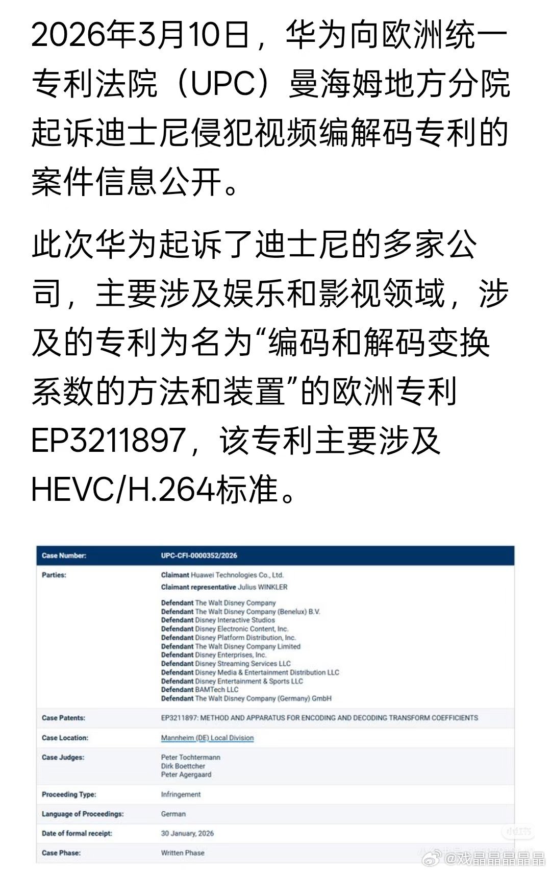 华为把有南半球最强法务的迪斯尼给告了,起诉它侵犯了华为的专利权。