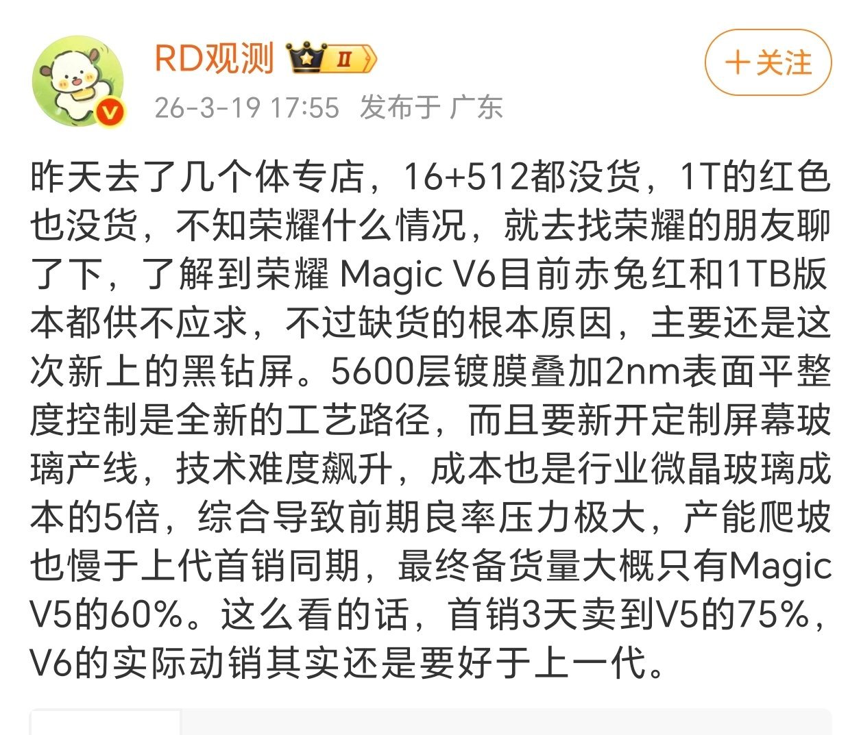 Magic V6真的是太火爆了。线下门店16+512都卖缺货了。赤兔红和1TB版更是一机难求,首销3天就达到上代V5的75%,想想V3、V5可是折叠屏市场份额仅次华为第二的存在呀。这次的V6全方位升级,如果产能跟上的话肯定会远超V5的。全新黑钻屏确实看着舒服,5600层镀膜叠加2nm表面平整度控制,加上全新屏幕玻璃,耐刮抗摔,强光暗光都清哳。飞姐飞哥咱V6产能快点跟上呀,特别512版和赤兔红线上线下都缺货了。