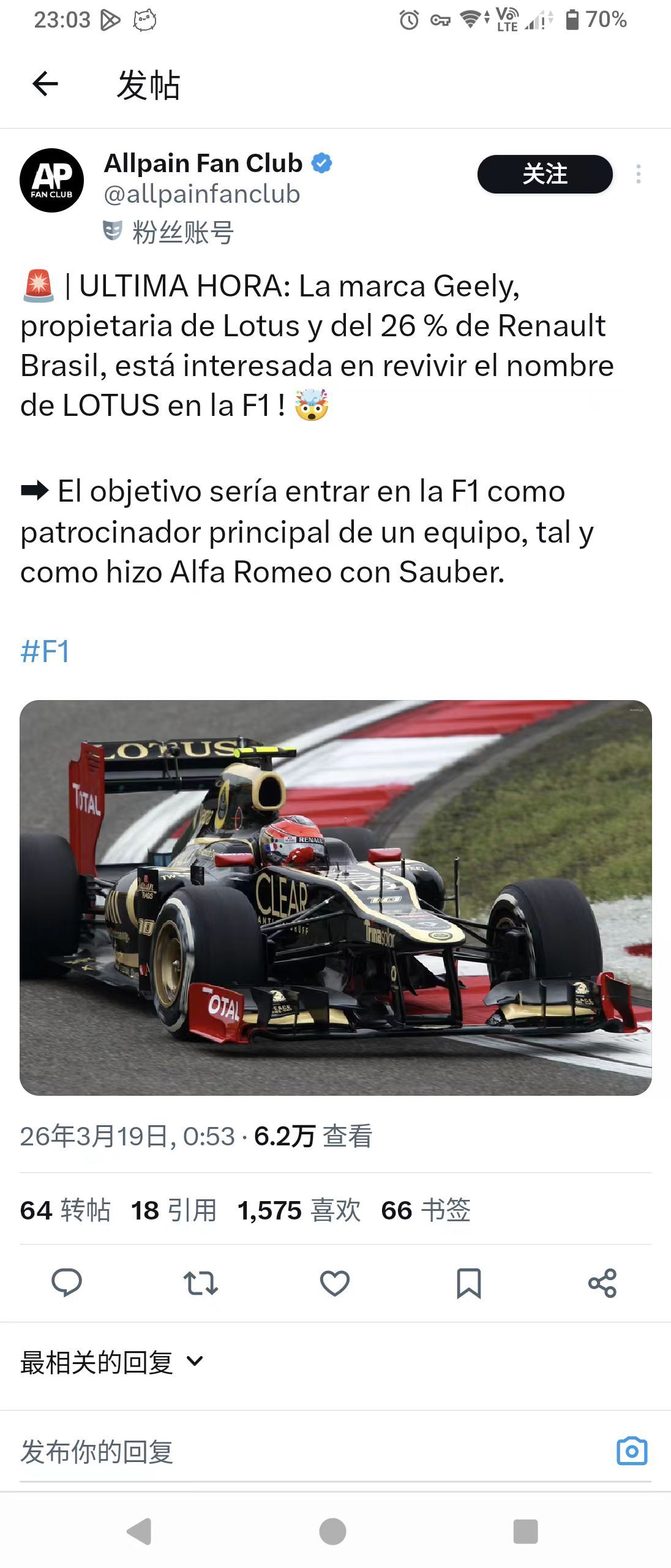 吉利要进F1,复兴Lotus莲花。坊间传闻,随便一看,万一呢 汽场全开