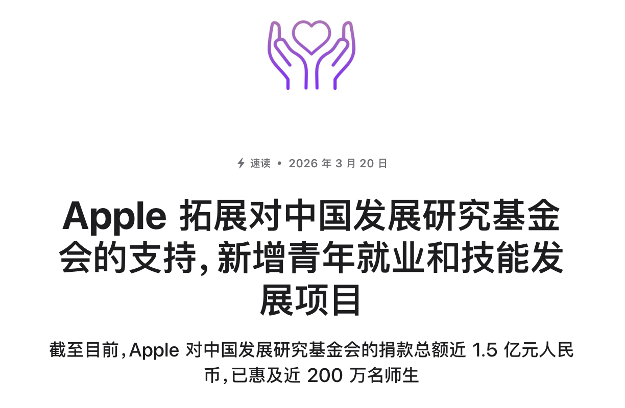 Apple今天宣布向中国发展研究基金会增加捐款,启动了一个全新的青年就业与技能发展项目。这个项目主要面向欠发达地区,通过与职业院校和行业专家的合作,帮助那里的学生掌握未来职场真正需要的核心技能,直接对接劳动力市场的真实需求。