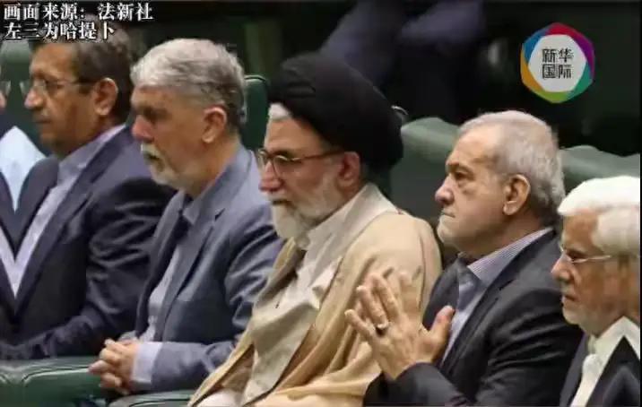 哈提卜生前留影,坐在佩泽希齐扬身旁的他打扮和哈梅内伊很像,黑帽子长袍戴眼镜。他的