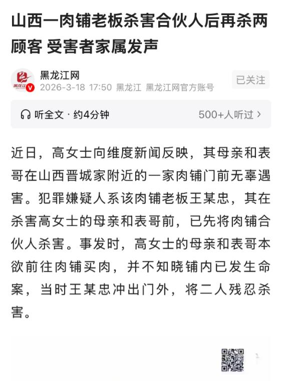 令人发指!”山西晋城,两名男子合伙经营一家肉铺20余年,因矛盾产生积怨。一日,其中一名男子持刀进入肉铺,将合伙人杀害。不幸的是,两名顾客在这时候,欲进店买肉,完全不知危险在靠近。男子完全失去理智,又持刀到门外,将两名顾客无辜杀害。事后,家属悲痛欲绝,希望严惩凶手,并要求赔偿。网友:杀害两个买肉的,太不应该,凶手真是穷凶极恶,判一百次死刑都不为过! 现在是2026年3月,距离山西晋城那一条老街上发生的三个人死去的惨案,已经过去了半年。 事情要从2025年9月的那个清晨说起,天还没亮透,肉铺的卷帘门被人早早拉开了一道缝。 李某生像往常一样,提前来到他和王某忠合伙开的肉铺,开始自己一天的工作,丝毫没意识到,一场致命的危机,正在向他逼近。 没过多久,王某忠也来了,但是他脸上没有任何表情,手里揣着一把水果刀,进门后就直直地站在原地,盯着忙碌的李某生,眼神里满是偏执和怨气。 李某生忙完手里的活,转头看到他这副模样,还没开口,王某忠就像疯了一样冲了上去,手里的刀毫不犹豫地扎进了他的胸口。 李某生甚至没来得及发出一声呼救,就重重地倒在了肉案旁,再也没有醒过来。 就在这时,住在附近的高某玲带着自己十五岁的侄子高某阳走了进来,他们是这家肉铺的老顾客,一大早过来只是想着买些新鲜的肉。 王某忠猛地转过头,看到两个毫无防备的人,像是被瞬间刺激到,二话不说就冲向了他们。 他先是朝着年纪更小的高某阳扑过去,一刀就刺中了孩子的颈部,高某阳还没来得及明白发生了什么,就倒在了地上没了呼吸。 高某玲吓得浑身发抖,转身就想往家跑,可王某忠根本没给她逃跑的机会,快步追上去,朝着她的腹部连捅两刀,高某玲踉跄着倒在地上,挣扎了几下,也没了动静。 短短几分钟,三条人命就没了,整条街都被恐怖的气氛笼罩着。 王某忠杀完人后没有逃跑,就坐在肉铺门口的台阶上,一动不动,直到有早起的路人路过,看到地上的尸体,吓得赶紧报警,民警赶到后将他抓获。 两人都是土生土长的晋城人,三十出头就凑钱开了这家肉铺。 二十三年来,他们从来没红过脸,房租一人一半,看店也轮流来,不分周末和节假日,哪怕是过年,也只是互相换半天班,大家都羡慕他俩的交情。 他们还定了个简单的规矩,肉铺当天赚的钱,归当天看店的人,这么多年,两人都守着这个规矩,互不计较,合作得十分默契。 可谁也没想到,这份维持了二十三年的情谊,最终还是被现实和金钱打败了。 2025年4月李某生总觉得脖子不舒服,去医院检查后被确诊为甲状腺癌,光手术费就需要八万多。 他想暂时停一停自己在肉铺的工作,先安心治病,等病情稳定了,再回来一起经营。 可他万万没想到,自己这个合情合理的想法,却被王某忠一口回绝了。 那时的王某忠正为女儿的婚房装修犯愁,装修差了八万,这笔钱他全指望肉铺的收入来填补。 在他看来,李某生要是不干了,他一个人根本忙不过来,肉铺一旦关门,他的装修钱就彻底没了着落,所以他不仅不同意李某生停生意,还多次逼着李某生退伙。 王某忠还提出要是退伙,只能退还李某生一半的本金,理由是现在肉铺生意不景气,亏了钱。 李某生自然不肯同意,从4月到9月,两人因为这件事,吵了一次又一次,昔日的情谊,在一次次的争吵中,慢慢被消耗殆尽,王某忠的怨气也一点点攒到了顶点。 案发前,王某忠还向亲戚借了五万块,可还是不够装修钱,他也曾找李某生协商,让他先退伙,等自己装修完婚房,再让他回来继续合伙,可李某生因为妻子治病急需用钱,还是拒绝了他。 就是这份拒绝,成了压垮王某忠的最后一根稻草,让他彻底失去了理智,走上了极端的道路。 这场命案毁掉的不仅仅是三条生命,还有三个原本幸福的家庭。 李某生的妻子秦女士听到丈夫遇害的消息,当场就昏厥了过去,如今的她一边要忍受癌症治疗的痛苦,一边要承受丧夫之痛,家里没了经济来源,连基本的生计都成了问题,日子过得十分艰难。 高某玲的丈夫张先生,至今都无法接受这个事实,自己的妻子和侄子,只是去买个肉,就再也回不来了,一家人整日沉浸在悲痛之中,难以自拔。 高某阳的父亲患有精神疾病,常年住在养老院,至今都不知道,自己年仅十五岁的儿子已经永远离开了他。 按照我国刑法的相关规定,王某忠提前携带刀具,属于有预谋杀人,故意夺走三条人命,情节特别恶劣,主观恶性极深,大概率会被判处死刑。 而三户受害人家属,也可以通过刑事附带民事诉讼,主张医疗费、丧葬费等相关赔偿,弥补自己的损失。 二十三年的情谊,终究抵不过金钱和一时的冲动,王某忠为自己的行为付出了沉重的代价,可三条人命再也回不来了,三个破碎的家庭,也永远失去了往日的温暖。