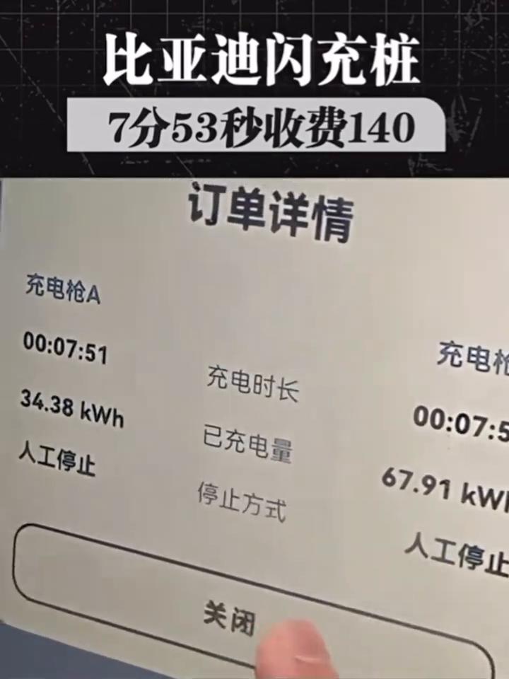 比亚迪闪充桩7分53秒收费140。 在比亚迪闪充桩充一次要花多少钱?充了7分钟花了140块钱。充电时长7分53秒,充电费用140。本来刚想吐槽比亚迪的闪充怎么收费这么贵,7分53秒就要收费140。结果镜头一转,大哥充的居然是一辆卡车。这换成油费一趟至少要1400以上。