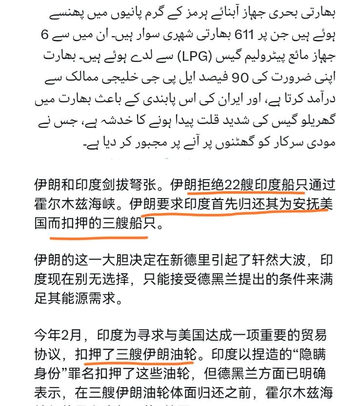 伊朗跟印度关系剑拔弩张了!外媒报道称,伊朗已经拒绝22艘印度船只通过霍尔木兹海峡的请求! 3月20日,根据外媒称,伊朗拒绝允许22艘印度船只通过霍尔木兹海峡。不仅如此,伊朗还要求印度归还其扣押的三艘伊朗船只。 外媒表示,今年2月份,印度试图与美国达成一项重大贸易协议时,扣押了三艘伊朗油船。 而这场对峙的导火索,明明白白握在印度自己手里。今年 2 月,印度为了和美国敲定一项重大贸易协议,甘愿充当美国制裁伊朗的马前卒,在孟买外海强行扣押了 3 艘伊朗油轮,还冠冕堂皇地找了个 “船只隐藏身份、非法转运石油” 的借口。 这哪里是正常执法,分明是给美国递上的投名状,想用牺牲伊朗利益的方式,换美国在贸易、关税上的让步。 霍尔木兹海峡被称作世界油阀,全球三分之一的海运原油、20% 的液化天然气都要从这条狭窄水道通过,日均运输量高达 2000 万桶,平均每 5 分钟就有一艘油轮驶过,沙特、阿联酋、卡塔尔等海湾产油国的油气出口,几乎全靠这条通道。 对印度来说,这条海峡更是生死线,印度 73.4% 的进口原油要经此运输,作为全球第二大液化石油气进口国,印度每年消耗 3300 多万吨液化气,超 60% 依赖进口,其中 90% 的进口液化气来自海湾国家,全部要走霍尔木兹海峡。 如今伊朗卡住海峡关口,等于直接掐断了印度的能源大动脉,这记反击精准又致命,打在了印度最疼的地方。 被拒绝通行的 22 艘印度船只上,载着 611 名印度船员,在海峡水域进退两难,其中还有 6 艘专门装载液化石油气,直接关系到印度国内的民生供应。 印度有 3.32 亿家庭依赖液化气生火做饭,一旦液化气运输中断,供应缺口会立刻显现,物价上涨、民用气短缺都是板上钉钉的事。 此前海峡航运受阻时,印度国内已经出现液化气库存告急的情况,不少餐馆被迫停止煎炸类菜品,老百姓开始抢购燃气罐,电磁炉销量直接暴涨 30 倍,如今 22 艘船被卡,只会让本就紧张的能源局势雪上加霜。 印度不是第一次在伊朗问题上犯傻,早在 2019 年美国全面制裁伊朗时,印度就乖乖听从美国指令,暂停了从伊朗进口原油,结果立刻遭遇国内原油供应紧张、油价一路飙升的困境,通胀率直接突破警戒线,普通民众的生活成本陡增。 最后印度只能偷偷绕开制裁恢复进口,还被美国公开批评,落得里外不是人的下场。 按理说吃过一次亏该长记性,可印度为了讨好美国,这次直接变本加厉,从暂停进口升级到扣押油轮,彻底触碰了伊朗的底线,换来如今的反击,完全是咎由自取。 伊朗的强硬从来都不是说说而已,面对美国及其追随者的打压,伊朗向来针锋相对。此前美国盟友的船只在海峡挑衅,伊朗果断采取管控措施,绝不姑息。 这次印度主动递刀,伊朗自然要抓住印度的能源软肋重拳出击,就是要让所有跟风美国、针对伊朗的国家看清楚,得罪伊朗要付出怎样的代价。22 艘印度船只被困、611 名同胞漂泊在外,印度政府此刻的狼狈,都是自己亲美立场种下的苦果。 更可笑的是,印度满心以为抱上美国大腿就能有恃无恐,却忘了美国从来都是利益至上的利己主义者,只会利用印度制衡他国,根本不会为印度出头。 美国当年在阿富汗撤军,毫不犹豫抛弃当地盟友,面对中东冲突只顾自身利益,如今印度陷入能源危机,美国全程袖手旁观,连一句象征性的声援都没有。 印度心心念念的美印贸易协议,不过是美国画的一张大饼,印度为了这张虚无的饼,赌上了本国的能源安全和民众生计,最终沦为美国的棋子,被用完就弃。 现在的印度陷入了彻底的两难绝境,一边是美国许诺的贸易利益,舍不得轻易放弃;一边是伊朗掐住能源咽喉,不归还油轮就别想船只通行,国内民生随时可能崩盘。 归还扣押的油轮,等于当众打自己的脸,彻底得罪美国;拒不归还,22 艘船一直被困,液化气、原油供应持续中断,国内民众的不满情绪会彻底爆发,莫迪政府的执政根基都会受到动摇。 印度一直自诩地区大国,妄图在美伊之间左右逢源,结果两头不讨好,把一手好牌打得稀烂,所谓的大国雄心,在能源危机面前显得无比可笑。 印度的悲剧,说到底是盲目站队、放弃独立自主的悲剧。放着和伊朗长期稳定的能源合作不珍惜,非要依附西方霸权,把本国的民生命脉寄托在别国的脸色上,最终搬起石头狠狠砸了自己的脚。 611 名印度船员在海峡苦苦等待,千万家庭要面临燃气涨价的压力,这一切都是印度政府亲美政策带来的后果,最终买单的却是普通民众。 伊朗的态度始终明确,不归还油轮、不改变对伊立场,印度船只就别想通过霍尔木兹海峡。 这场对峙没有任何妥协的余地,印度想要化解危机,唯有放弃亲美反伊的错误路线,老老实实归还扣押船只,重新回到平等合作的轨道上来。 否则等待印度的,只会是更严重的能源危机、更剧烈的国内动荡,自己种下的苦果,终究只能自己咽下去,这就是盲目跟风美国、肆意挑衅他国的最终下场。