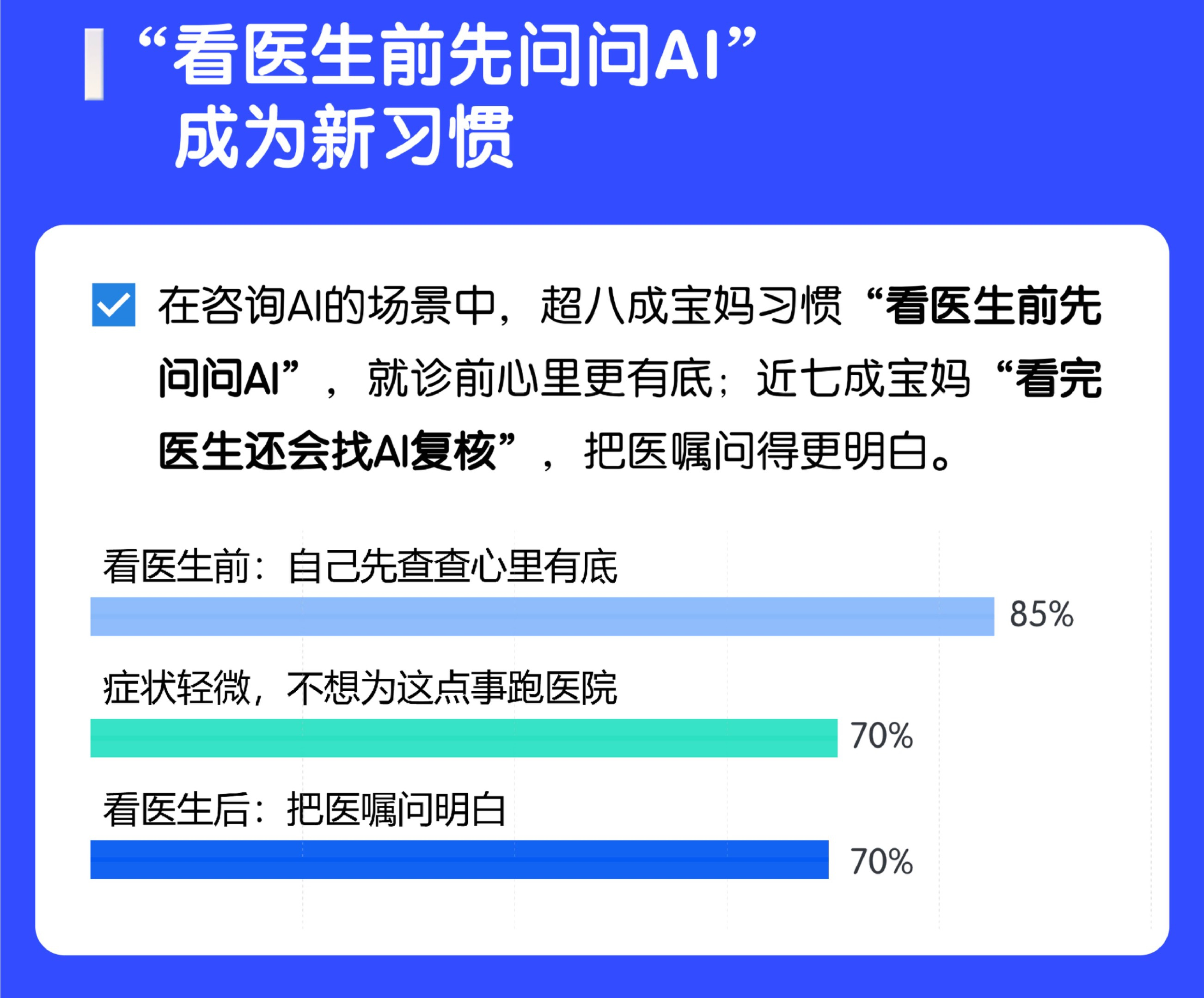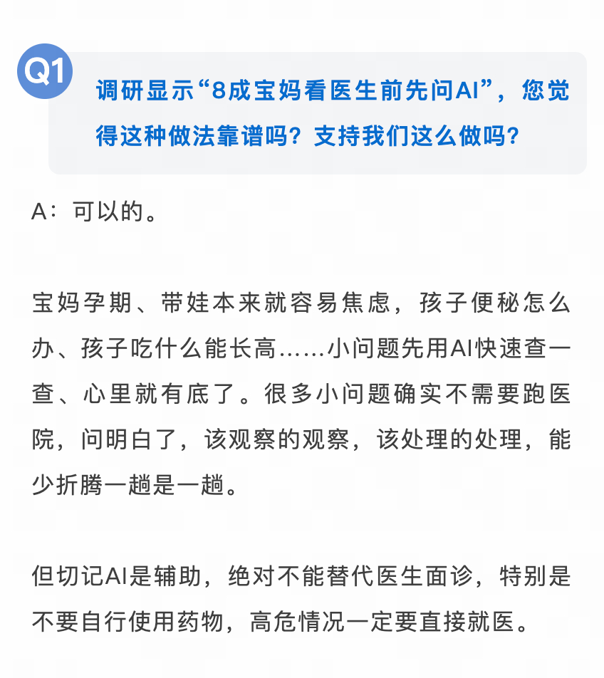 我觉得这些数据很有价值,AI已深入改变患者的就医行为与医生的接诊模式,不止发生在宝妈身上。比如我有一次去看慢性咽炎,提前查了一下,结果到医院,医生给我的嘱咐,和AI说的相差无几。