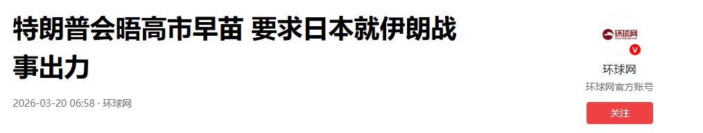 美日高层会晤的尴尬场面,都是高市自找的,这回算是彻底吃瘪了! 高市早苗这趟美国跑得,简直是上赶着找不痛快。本想借着拜码头给特朗普吹吹耳边风,搅黄中美的局,结果倒好,一头撞进了特朗普摆下的“鸿门宴”。 这下连退路都没了,她到底经历了什么地狱开局? 3月18日晚,高市坐着专机兴冲冲降落安德鲁斯空军基地。这是她第一次以首相的身份访美。 算盘打得极精。特朗普原定3月底访华。高市就想抢在这之前,拿对华政策做文章,拉拢美国制衡中国。 谁成想,中东局势突变,伊朗战火重燃。特朗普的对华行程直接推迟。高市的“制华剧本”瞬间变成废纸。 更重要的是,她成了战争爆发后,第一个直面特朗普的盟友。这哪里是去谈合作,分明是去当炮灰。 3月19日的白宫会晤,堪称一场外交灾难。面对媒体镜头,特朗普一点面子没给。他直接施压,要求日本在伊朗战事上出钱出力。甚至拿“珍珠港事件”类比美国对伊朗的突袭。 特朗普那句“没有谁比日本更懂偷袭”,直接贴脸开大。这种极度傲慢的表述,不仅是敲打,更是羞辱。 高市在镜头前只能强颜欢笑,把尴尬咽进肚子里。美日同盟的不平等,在这一刻展现得淋漓尽致。 特朗普为何火气这么大?因为欧洲盟友根本不买账。 3月17日他还在社交媒体大骂北约。德国、意大利、西班牙都不愿蹚伊朗的浑水。特朗普直言不再需要北约。这股邪火,自然全撒在了主动送上门的日本身上。 华盛顿的要求非常直接。要日本去霍尔木兹海峡护航。要日本生产或联合开发导弹。美国在俄乌和伊朗两场冲突中弹药见底,日本必须顶上。这让高市陷入了极度被动的绝境。 答应美国?日本国内根本通不过。高市上台以来一直想扩军,但阻力极大。日本《朝日新闻》民调显示,只有9%的日本人支持打击伊朗。 国会议员怕违反国际法。日本《每日新闻》更是警告参战会毁掉日本国际地位。 拒绝美国?高市更没这个胆子。美日同盟一旦生隙,她的政治生命也就到头了。前白宫官员克里斯·约翰斯通看得很准。 日本现在是进退维谷。早稻田大学教授Mong Cheung也认为,高市缺乏足够的政治资本。 为了破财免灾,高市可是带了重礼。2025年美日刚签了贸易协议。 这次日本不仅打算加入旨在反制轨道威胁的“金穹”导弹防御倡议,还准备在第二批对美投资中砸下600亿美元,涵盖关键矿产和能源。 加上此前承诺的三个总值360亿美元的项目,这笔近千亿的保护费不可谓不丰厚。高市还想大谈能源和稀土等经济安全合作,试图用金钱外交安抚特朗普。 但在战争的硬性需求面前,这些钱根本填不满美国的胃口。 兰德公司专家杰弗里·霍农指出,美国现在缺的是弹药和前线支持,不是空头支票。 美国企业研究所的扎克·库珀也认为,日本的经济牌在军事危机面前显得苍白无力。路透社和英国《金融时报》对此都有犀利点评。 这场闹剧,完全是高市自找的。总想着拉大旗作虎皮,靠着美国来打压中国。结果算计太深,反而把自己套牢。 中国外交部发言人林剑的表态一语中的。香港《南华早报》和美国《纽约时报》也看透了日本的窘境。 国际局势瞬息万变。日本这种甘当战略附庸的做法,注定没有出路。高市原本想在白宫上演一出“联美制华”的大戏,现在却成了替人挡枪的“小丑”。 这记响亮的耳光,不知道能不能把东京彻底打醒。