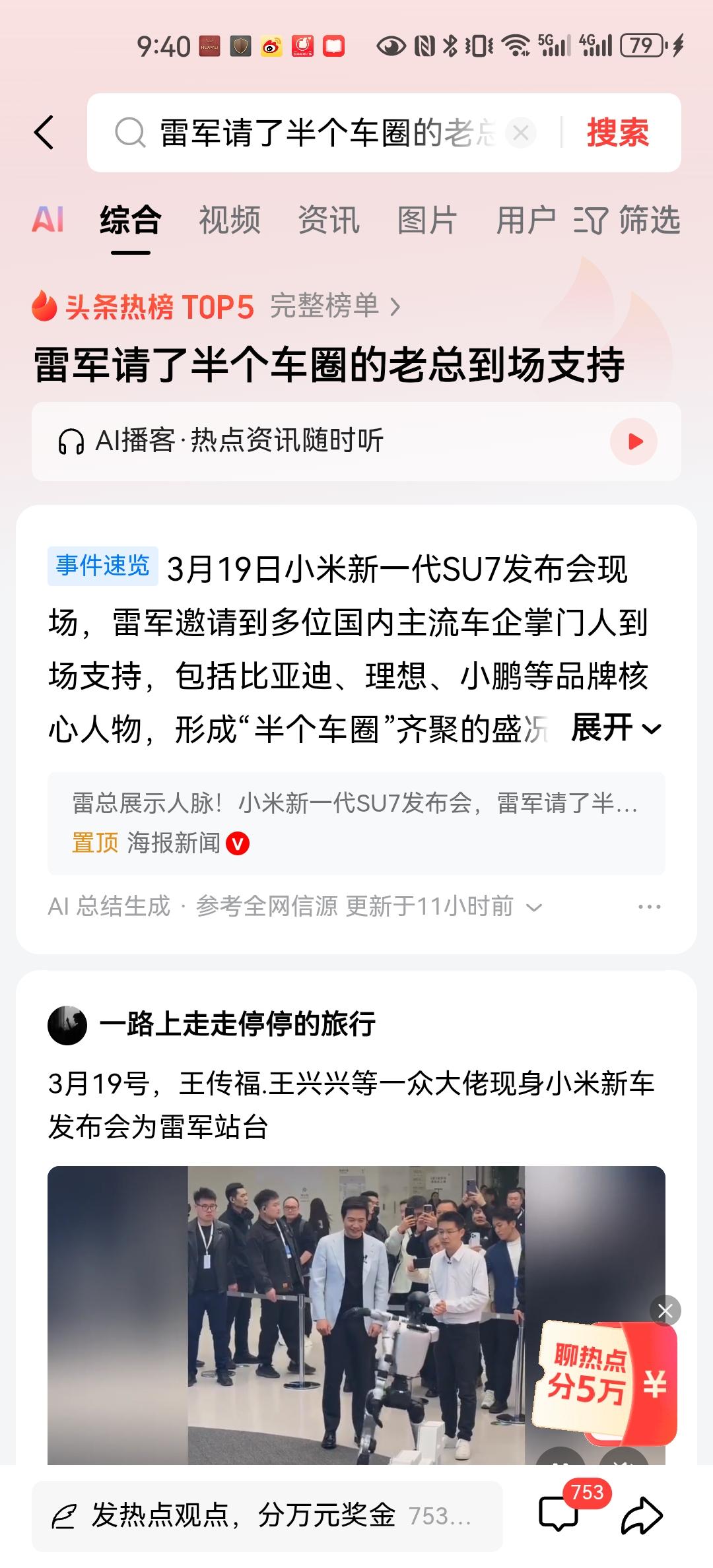 可以说这一次雷军发布新款SU7,将中国新兴的车企的掌门人基本上都请来了,有着比亚迪王传福、蔚来李斌、还有着新势力的理想李想、小鹏何小鹏、以及同样个性鲜明的长城魏建军。但是就没有周鸿祎,其实人家在投资某家车企之后,也算是车企的老板了。在照相的时候也没有排什么座次,大家很和谐的站在一排。 这一次的代言人请了舒淇,取的是一个谐音梗,看来雷军平时不但笑呵呵的,还是比较喜欢开玩笑。不过这个代言人请的还是有点值得商榷的,如果小米SU7面向的受众群是年轻的90后一代,那么有可能舒淇对他们来说就有点陌生了,大家觉得呢? 在传统的燃油车技术赛道,我们永远不可能超越那些欧美车企,但是在新兴的新能源车企赛道,我们绝对是越来越领先了。而世界的未来就是新能源车,燃油车终将被淘汰,这一次油价反复暴涨,更是加快了燃油车的退出。 希望雷军能做得更好一些,也希望中国新能源车企也能表现更好一些!