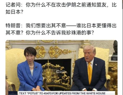 特朗普当面羞辱日本首相高市早苗。 说白了,特朗普这回是当着全世界的面,把日本首相的脸皮按在地上摩擦。3月19日白宫椭圆办公室,高市早苗刚坐下没几分钟,记者就抛出那个致命问题:为啥打伊朗不提前通知盟友?特朗普脖子一梗,张嘴就来:“我们想要出其不意,还有谁比日本更懂这个?你咋不先告诉我珍珠港的事?” 现场一阵哄笑,镜头扫过去,高市眼睛瞪得溜圆,身子在椅子上来回挪了好几下,硬是挤不出一个字。 要知道,珍珠港这三个字,在美国人心里从来就不是能随便开玩笑的。1941年12月7日那场偷袭,炸沉8艘战列舰,干掉2400多美军,罗斯福当天就定性为“国耻”。二战结束八十年,历任美国总统都绕着这个话题走,奥巴马2016年还专程去珍珠港献花圈,跟安倍晋三演了一出“和解大戏”。结果特朗普倒好,直接把这事当段子讲,还专挑日本首相在场的时候。 更让东京方面难堪的是,高市这次访美带去的是实打实的真金白银。为换取美国关税减免,日本承诺了5500亿美元的投资大单,会晤后当场敲定730亿美元的商业合作,其中光核能项目就投了400亿。三菱重工、东芝这些巨头都在等着这笔订单填饱肚子,结果换来的却是被当众扒历史伤疤。日本网友自己都看不下去了,有人在社交媒体上留言说这是“用几百亿买回来一张嘲讽脸”。 没想到,特朗普的算盘远不止翻旧账那么简单。他一边拿珍珠港开涮,一边对日本喊话“霍尔木兹海峡得给我出人出力”。日本超过90%的原油进口得经过那条海峡,能源命脉捏在美国手里,高市除了点头还能说啥?当年被偷袭珍珠港的仇家,如今却要主动凑上去帮人家看家护院,还得陪着笑脸听人家拿这事开涮。 对此,布鲁金斯学会的专家都看不下去了,说特朗普这番言论“实属罕见”、“令人震惊”。可震惊归震惊,高市愣是一句硬话没敢回。驻日美军4.5万士兵、几十个基地在那儿摆着,日本每年的“温馨预算”一分不敢少交。嘴上喊着“日美同盟”,实际上谁求谁,高市心里比谁都明白。 另外,日本共同社的报道里写得隐晦,说高市“全程保持微笑”,可配图里那张脸,笑容僵得跟面具似的。NHK的镜头捕捉到一个细节:特朗普说完珍珠港那句话后,高市左手攥着裙角,指节都发白了。这种生理性的反应,比任何外交辞令都诚实。 说到底,特朗普敢这么说话,不是因为记性好,是因为他知道日本没得选。珍珠港这事放在其他盟友身上,早就炸锅了,可日本呢,钱照掏、船照派、笑脸照给。高市脸上那僵住的笑,就是给所有“倚美”的人上了一课——你以为你是座上宾,人家只当你是提款机,还是那种随时可以拿出来开涮的。强弱分明的时候,历史就是人家手里的一根棍子,想什么时候抡过来,就什么时候抡过来。 以上是小编个人看法,如果您也认同,麻烦点赞支持!有更好的见解也欢迎在评论区留言,方便大家一同探讨。