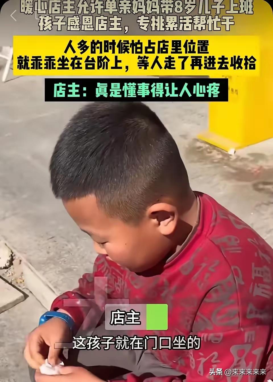 近日,呼和浩特的一家饭店,来了位特殊的求职者。是个从河北过来的单亲妈妈,身边牵着个8岁的小男孩,孩子攥着妈妈的衣角,全程怯生生地低着头。 在此之前,她已经跑了好多地方找工作,全被拒了。理由都差不多:带着个孩子,没法专心干活;店里人多手杂,孩子万一出了事,没人担得起责任。 房租、孩子的学费、日常的柴米油盐,样样都要花钱,她实在没了别的办法,只能红着眼眶,跟饭店的店主提了那个明知道不合规矩的请求:能不能让我带着孩子来上班?我肯定把活干好,绝不给店里添乱。 店主一开始也犯难。饭店前厅后厨,饭点忙起来脚不沾地,多一个孩子,难免有顾虑。可看着眼前女人眼底藏不住的绝望,还有她身后那个连头都不敢抬的小男孩,他终究还是松了口,点了头。 没人教过这个8岁的孩子该做什么,可他好像什么都懂。从进店的第一天起,他就没给任何人添过一点麻烦。 饭点客流最旺的时候,他会搬个小凳子,乖乖坐在店门外的台阶上,不占店里的位置,也不吵到用餐的客人。可他的眼睛,一直没离开过店里的动静,只要看见哪桌客人起身离座,他立马就从台阶上蹦起来,攥着小拳头小跑着冲进店里。 他会先把桌上的碗碟小心翼翼摞成一叠,端着沉甸甸的托盘稳稳往后厨送,踮着脚擦桌子,连桌面的边角都抹得干干净净,客人掉在地上的纸巾、骨头渣,他都要仔仔细细扫进簸箕里。 店里搬空的啤酒箱要码齐,地上沾了油污要擦,就连店主出门倒垃圾,他都要追在后面搭把手。店主好几次拦住他,让他去旁边歇着,他却仰着满是汗水的小脸,认真地说:“我不累,多干点活,妈妈和叔叔就不用那么累了。” 店主说,他当初就是心软,想帮这对母子一把,没指望过任何回报。可这个孩子的一举一动,一次次戳中他心里最软的地方。 有天晚上忙到十点多,最后一桌客人走了,妈妈还在后厨收拾收尾,孩子趴在柜台上写作业,困得脑袋一点一点的,不停揉眼睛,却不肯先去休息,说要等妈妈一起走。 店主看着灯光下那个小小的身影,看着他攥着笔的小手还在慢慢挪动,鼻子一酸,当场就红了眼。他活了大半辈子,见过太多精明算计的人和事,却从没见过这么小的孩子,把知恩图报这四个字,做得这么实在。 这件事传到网上,很多人都被戳中了。有人说,这孩子的懂事,是见过妈妈的难处,才拼尽全力想替妈妈多扛一点。也有人说,最难得的是店主的善意,他没有居高临下的施舍,只是给了这对母子一个能落脚的机会。 你给别人留了一点余地,别人也会用自己的方式,给你递上一份最朴素的回应。