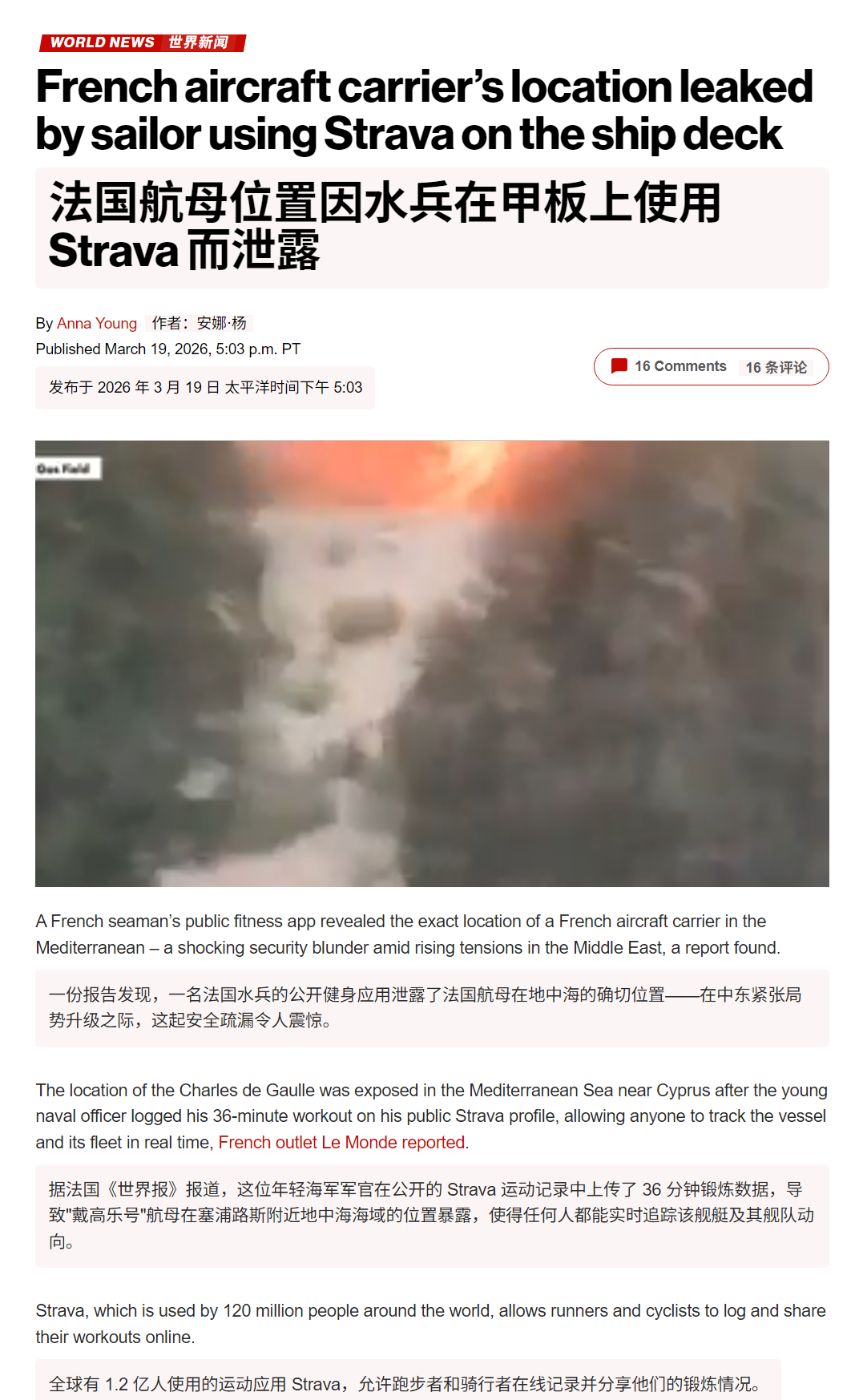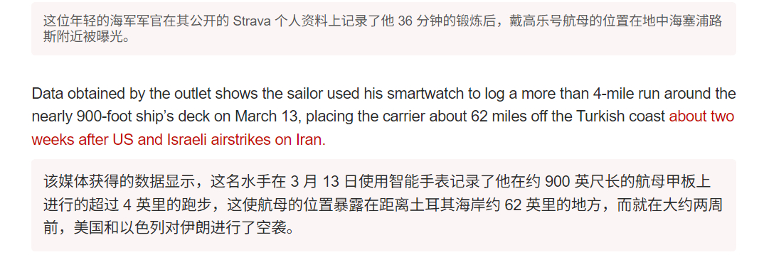 🔻一位法国海军水兵于 2026 年 3 月 13 日在一款流行的健身追踪应用 Strava 上公开分享了一次跑步训练记录。🔻该活动记录了一次约 7.23 公里的跑步,用时约 35-36 分钟,地点在海上的一艘船的甲板上,使用的是 Garmin Forerunner 955 手表。🔻由于他的 Strava 个人资料设置为公开状态,GPS 追踪路线(水面上呈现橙色锯齿状/环形图案)暴露了法国戴高乐号航空母舰及其打击群在东地中海塞浦路斯西北部的精确实时位置,距离土耳其海岸约 60-100 公里。🔻via 纽约邮报🔻法国人嘿伊朗导弹击中以色列海法炼油厂伊朗称击中美军F35战机中东现场直击海外新鲜事