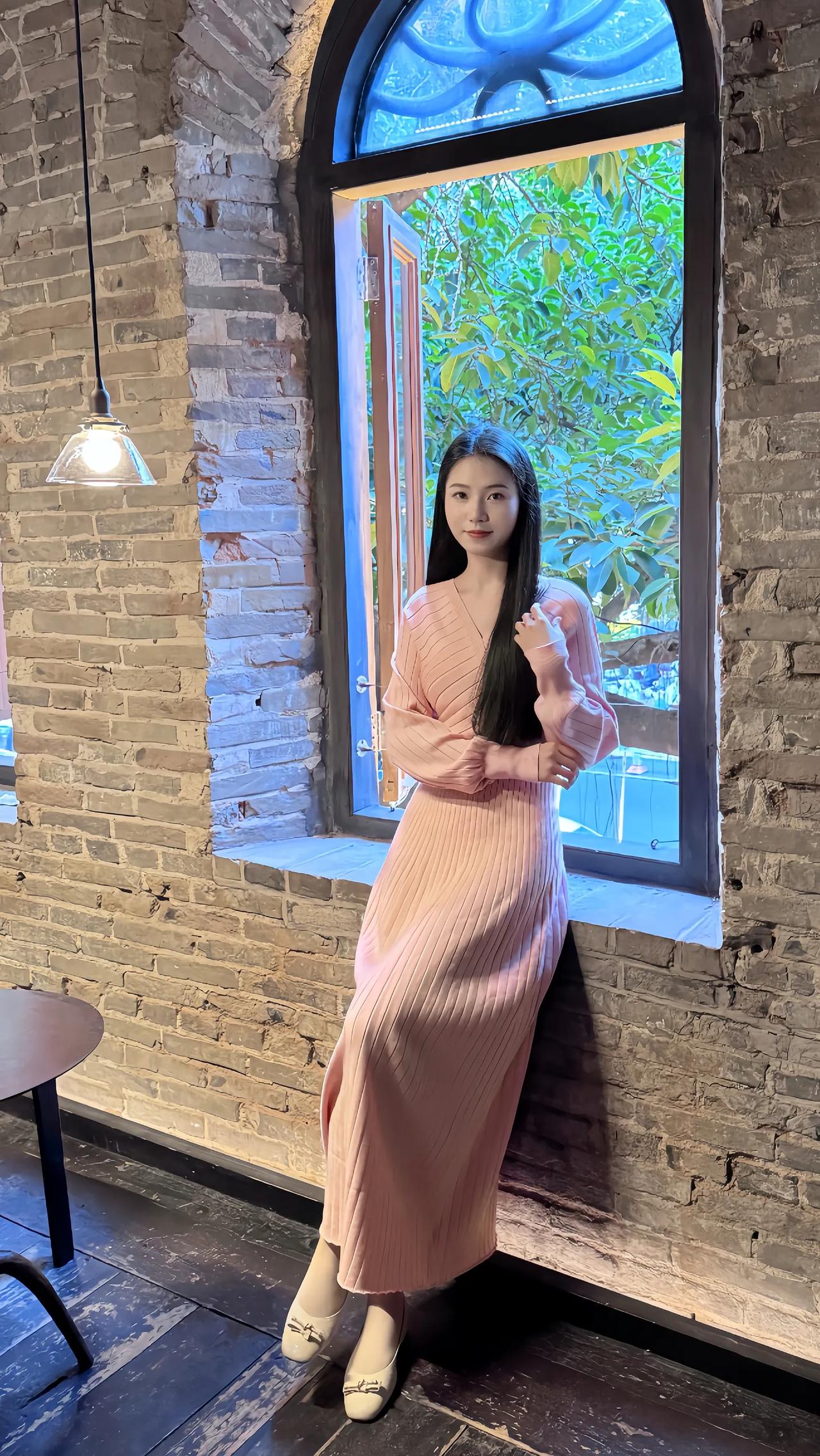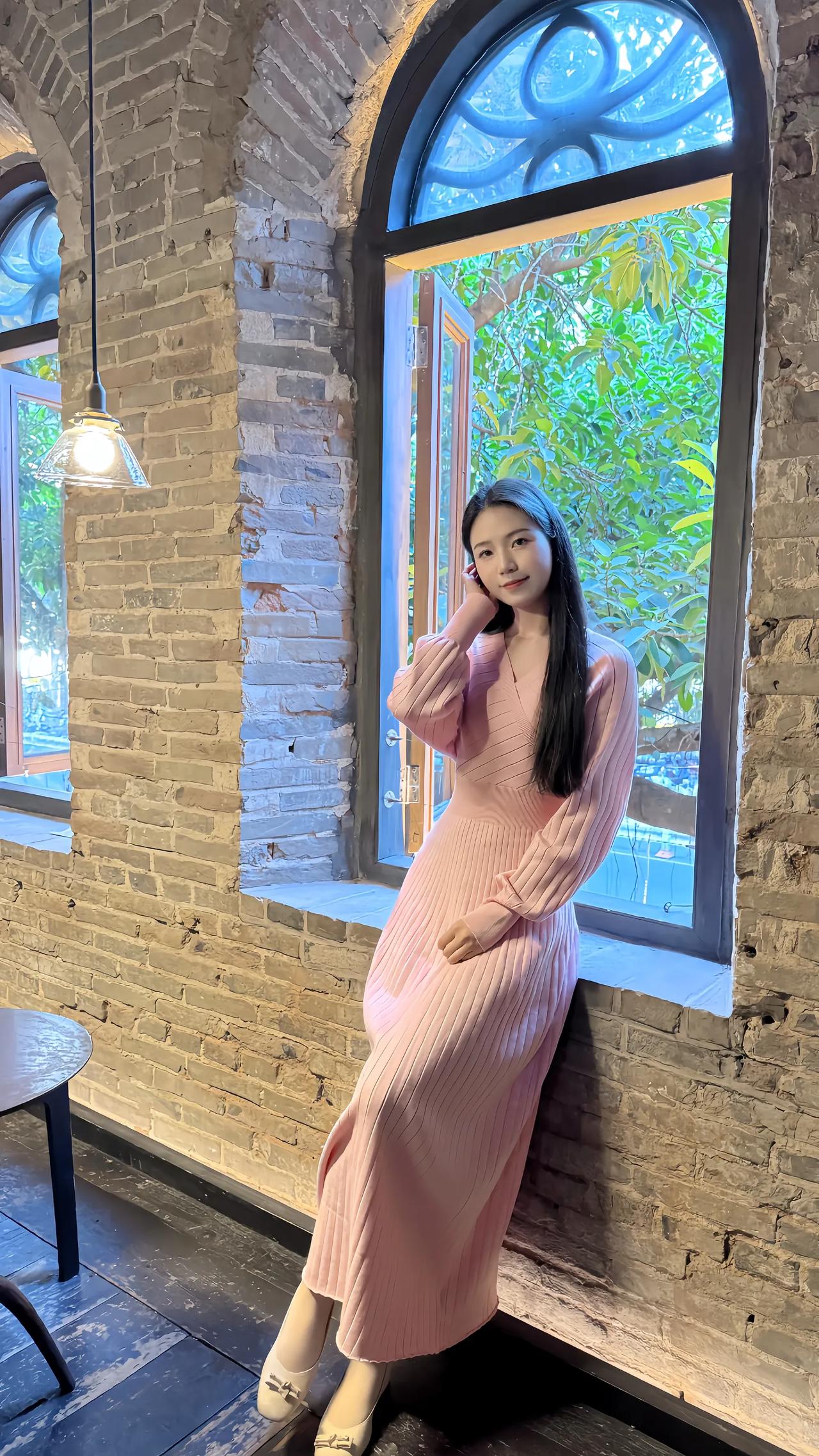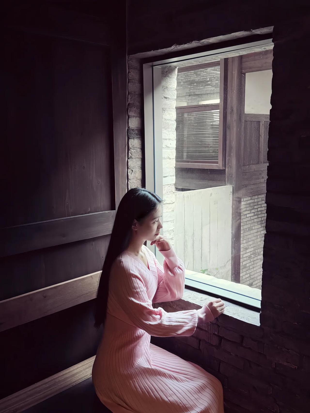 窗边少女,粉裙飘飘,静看绿意盎然。