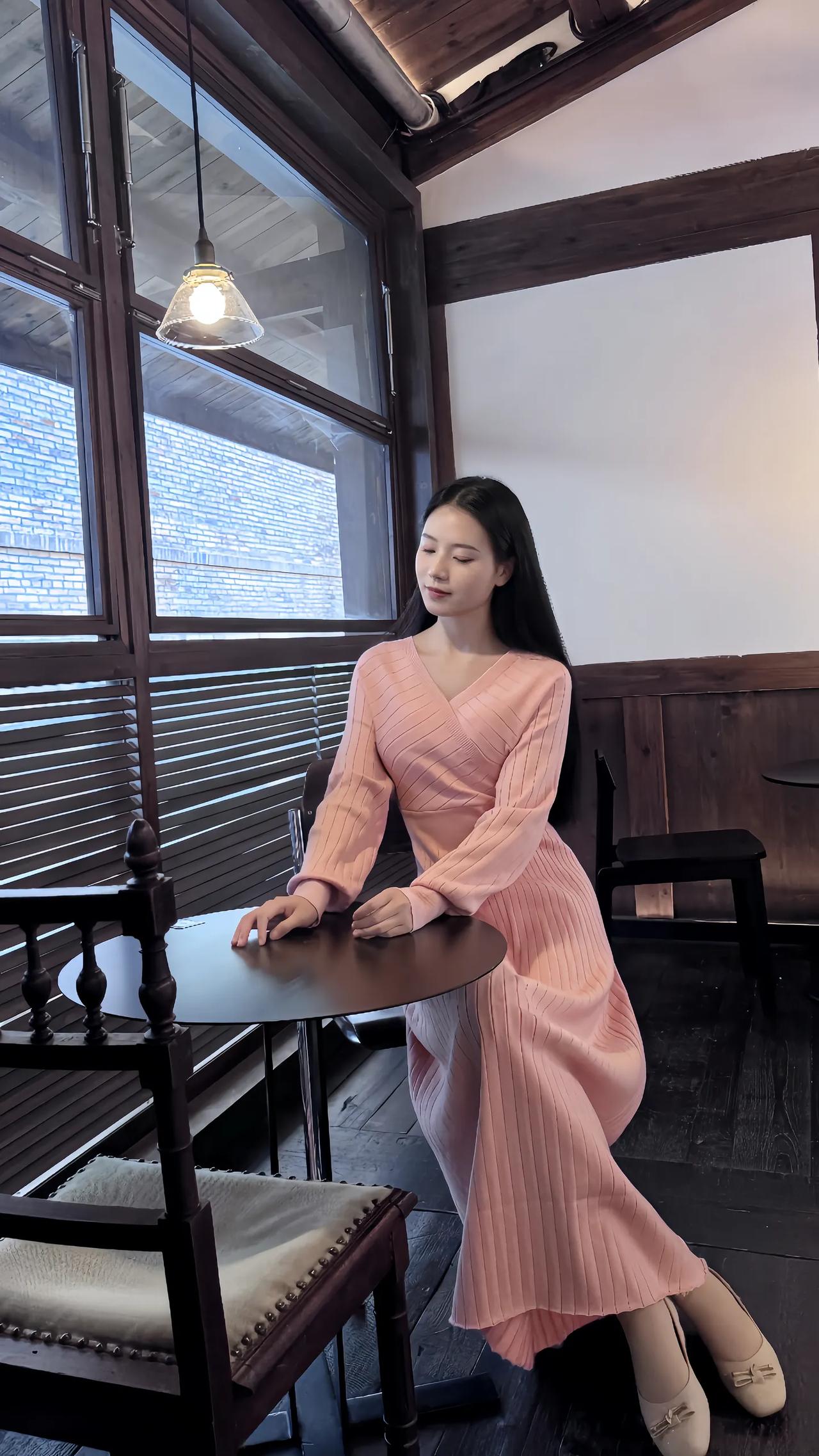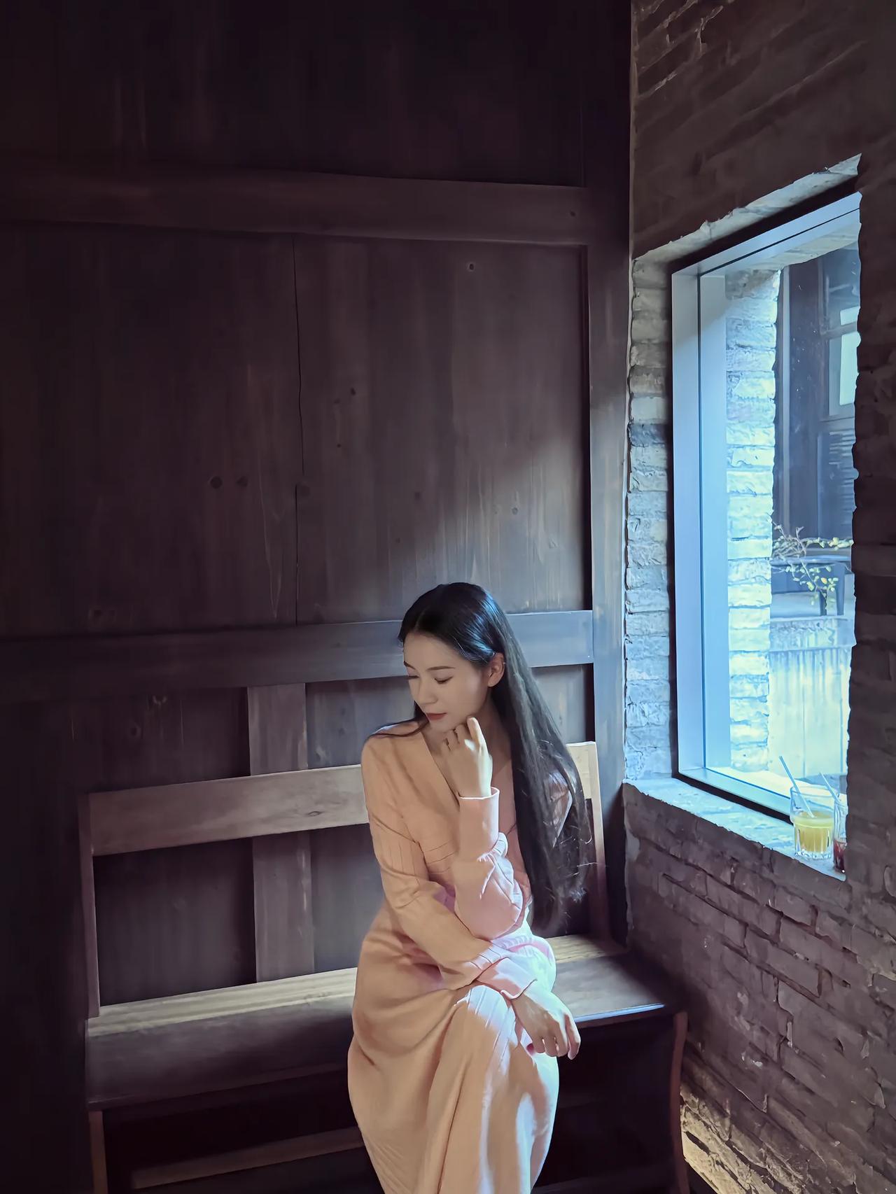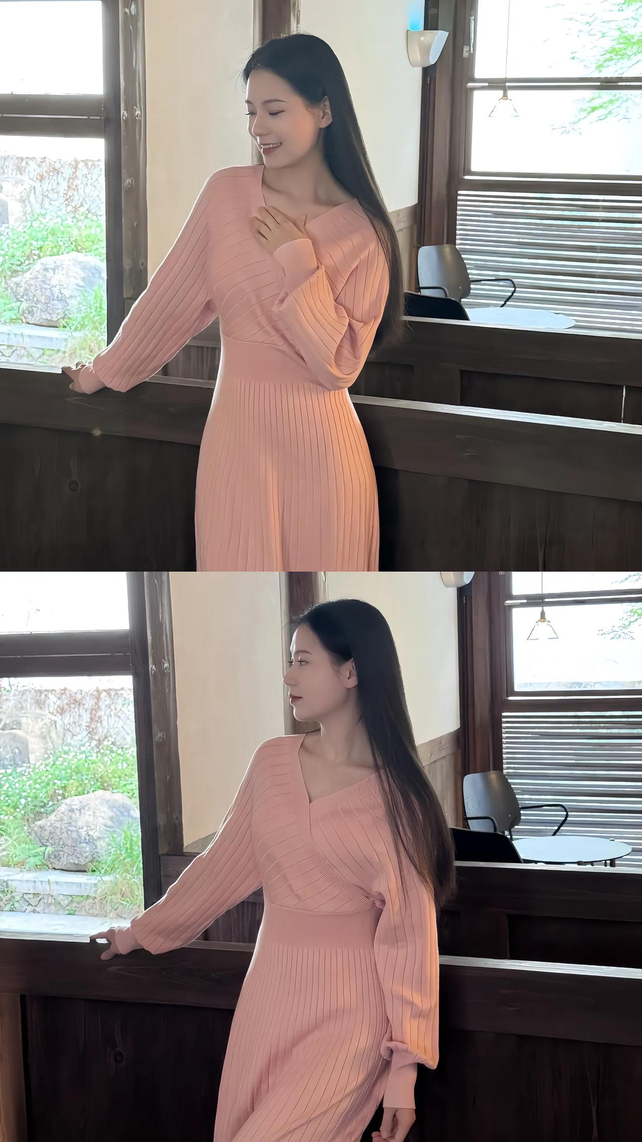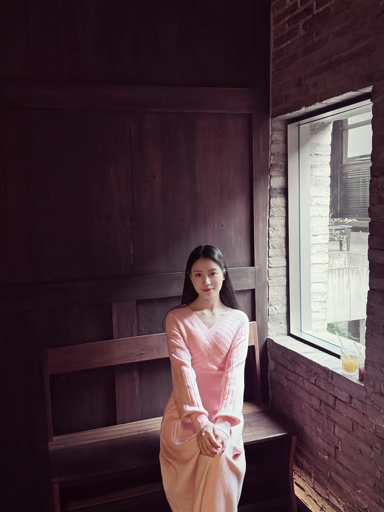 窗边少女,粉裙飘飘,静看绿意盎然。