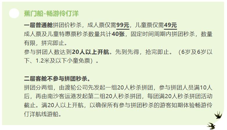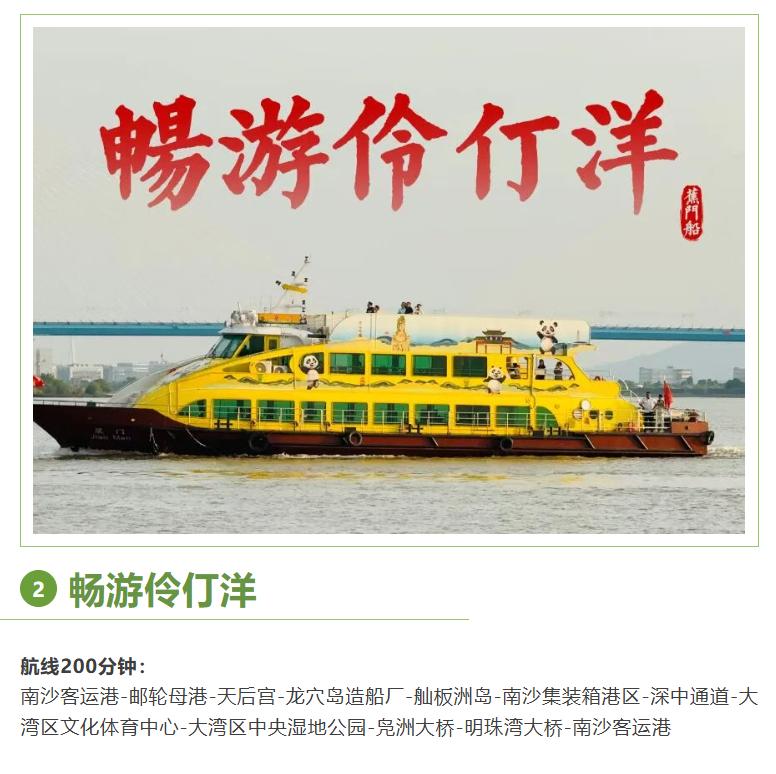 【海上看南沙航线5折大特惠啦!最低仅需68元】南沙最低调最值得一游的游乐项目海上看南沙终于开启特价了! 3月21日至4月21日横档船海上看南沙航线周六日固定航班大厅票日航前20名购票仅需68元,夜航前20名购票仅需88元。每天日航+夜航总计40张早鸟季特惠票限量发售,按购票顺序享受优惠,先到先得,抢完即止(6岁及6岁以下、1.2米及以下小童免票)。 另外畅游伶仃洋航线也有特惠,不过需要人数达到20人以上才会开航。 根据介绍海上看南沙分成A线和B线: A线(70分钟):南沙客运港-邮轮母港-南沙游艇会-上下横挡岛-虎门大桥-虎门渡口-南沙天后宫-南沙客运港 B线(140分钟):南沙客运港-南沙天后宫-慧谷超级堤-明珠湾大桥-国际金融论坛(IFF)-横沥、灵山“双岛尖” 畅游伶仃洋(200分钟):南沙客运港-邮轮母港-天后宫-龙穴岛造船厂-舢板洲岛-南沙集装箱港区-深中通道-大湾区文化体育中心-大湾区中央湿地公园-凫洲大桥-明珠湾大桥-南沙客运港 整体对比来说,畅游伶仃洋更加有趣一点,时间长,可以看舢板洲、广州港、深中通道、大湾区文化体育中心等等。更加丰富。 购票可以通过“海上叹南沙”小程序剁手哦。