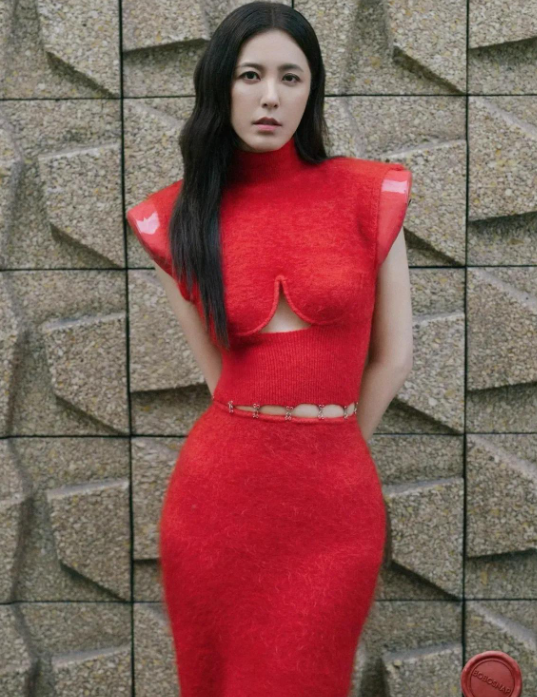曾黎身穿一袭红色毛衣款套装裙搭配尖头工鞋,真妩媚撩人啊