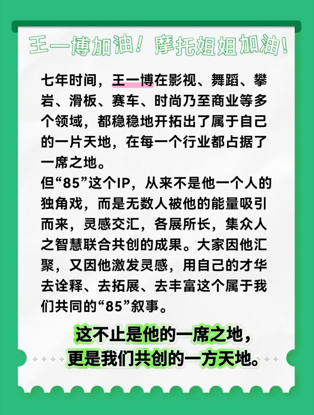 从春晚大爆到今天王一博已经遭受了数不尽的黑词条,之后也会一直有,越是这个时候摩托越要强大,要团结,要坚定的站在他的身后。