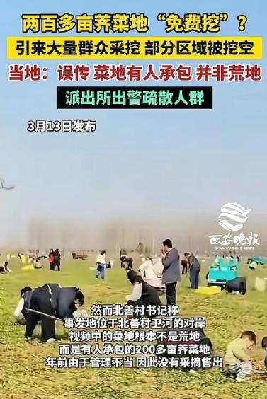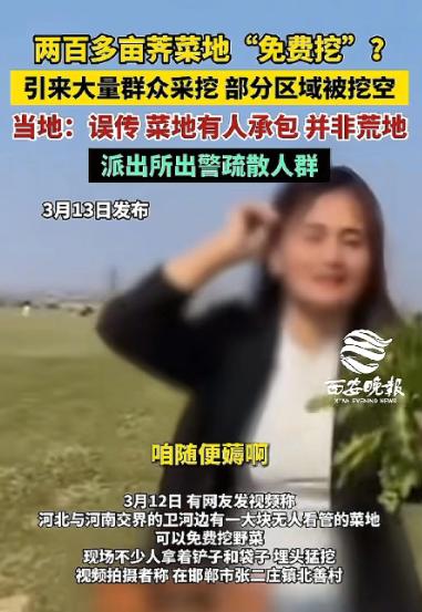 太嚣张!河南安阳,女子发现200亩荠菜,她不问主人,也不管地界,当场动手狂挖,还拍视频发到网上,甚至放话:免费的随便挖,还给出地址,消息一出,大批人蜂拥而至,整片荠菜被瞬间薅得精光。承包地主人赶到当场傻眼,拼命驱赶也拦不住,崩溃报警。女子结局大快人心! 河南内黄县马上乡,一片200亩的荠菜地,短短几个小时,就被上百人薅得光秃秃,地里只剩下翻乱的泥土、散落的菜根和废弃的塑料袋,放眼望去,连一根像样的荠菜苗都找不到。 这场闹剧的结局,其实早就注定——发视频喊人来挖菜的侯某某,被民警找到后彻底慌了神,没了当初拍视频时的嚣张,只能乖乖接受处罚,全额赔偿农户损失,还要接受行政处罚。 若是损失过大,甚至可能面临刑事追责,这样的结果,没人同情。 可能有人会问,好好的荠菜地,怎么会被哄抢成这样?这事说起来,全是侯某某的无知和自私造成的。 那天她在当地闲逛,偶然发现了这片长势喜人的荠菜地,绿油油、饱满鲜嫩,一眼望不到边。 正常人看到这么大片庄稼地,就算心动,也会先问问是谁承包的、有没有主人,可侯某某偏不。 她既不打听土地归属,也不查看承包标识,满脑子都是“免费荠菜”,当场就蹲下来疯狂开挖,挖够了还不满足,居然拿起手机拍短视频。 视频里的她,得意洋洋地对着镜头忽悠,说这片荠菜没人要,大家可以免费来挖,还特意报了地址,可笑的是,她连地址都报错了,把河南内黄县马上乡的地,说成了河北邯郸魏县张二庄镇的村子,闹了个跨省乌龙。 这条毫无底线、未经核实的短视频,发到网上后,传播速度快得惊人。 “免费”两个字,瞬间勾起了很多人的贪念,周边村子的村民拎着袋子、背着筐就往地里跑,几十公里外市区的人,也专门开车赶过来,就为了挖点不要钱的荠菜。 一时间,通往荠菜地的乡间小路,被私家车、三轮车堵得水泄不通,连人都挤不过去。 到了地里,所有人都失去了理智,有人带了铁锹,有人推了小推车,还有人全家出动,分工明确地挖菜、装菜,比收自己家的庄稼还卖力。 更离谱的是,还有网红跑到现场开直播,一边拍一边起哄,喊着“快来薅羊毛,免费荠菜随便挖”,硬生生把混乱的场面推得更严重。 这些人只顾着往自己袋子里装荠菜,根本不管脚下的田埂,把田埂踩得坑坑洼洼,菜根随手乱扔,塑料袋满地都是,好好的承包地,被糟蹋得不成样子。 没人知道,这片200亩的荠菜地,是一位农户辛辛苦苦承包下来的,是这户人家全家一年的生计来源。 据了解,这片荠菜亩产大概4000斤,市场单价1.5元左右,农户从翻地、播种,到浇水、除草,天天泡在地里忙活,就盼着收获时能卖个好价钱,补贴家用。 有人看到地里有人乱挖荠菜,赶紧给这位农户报了信。 农户一听,心里瞬间慌了,扔下手里的活,急匆匆地往地里赶,可等他赶到的时候,一切都晚了——地里的荠菜已经被挖得干干净净,多日的辛苦,全打了水漂。 看着被糟蹋的田地,农户急得直跺脚、掉眼泪,一边大声喊着“别挖了,这是我的地”,一边伸手去拦,可现场人太多了,根本没人听他的。 还有人反过来跟他抬杠,说“网上都说免费能挖,你凭什么不让挖”,气得农户一句话都说不出来,那种无力感,常人根本体会不到。 绝望之下,农户只能拿出手机报警,求民警来帮忙。 他心里清楚,这片荠菜没了,一家人一年的日子都没法过了,这是他们全家的指望,却被人这么肆意糟蹋。 民警接到报警后,很快就赶到了现场,看到满地的人群和狼藉的田地,也忍不住皱眉。 他们赶紧拿起喇叭,反复跟现场的人解释,说这片地是私人承包的,荠菜是农户的私人财产,不是免费能挖的,劝大家赶紧停手离开。 一开始,还有人半信半疑,以为民警在骗他们,直到民警反复宣讲相关法律规定,大家才恍然大悟,知道自己被骗了,纷纷停下手里的动作,收拾好东西匆匆离开,整个过程没有发生任何冲突,也算是不幸中的万幸。 民警随后也查实了地址的乌龙,明确这片地在卫河对岸,属于河南内黄县马上乡,并不是侯某某说的河北邯郸魏县。 疏散完人群后,民警就立刻着手调查发视频的侯某某,没花多长时间,就找到了她。 面对民警的询问,侯某某再也没了当初拍视频时的嚣张,当场就慌了神,支支吾吾说不出话来,她大概也没想到,自己随口一句忽悠人的话,会造成这么严重的后果,毁了别人的生计,也把自己推向了违法的边缘。 侯某某的行为,毫无疑问是违法的。 只是觉得,做人做事总得有底线,网络不是法外之地,别为了一时的贪念、一时的热度,就口无遮拦、肆意妄为,不然最后,只能自己承担所有后果,侯某某就是最好的例子。 那么到最后,你们是你怎么看的呢? 如果各位看官老爷们已经选择阅读了此文,麻烦您点一下关注,既方便您进行讨论和分享,又能带来不一样的参与感,感谢各位看官老爷们的支持!