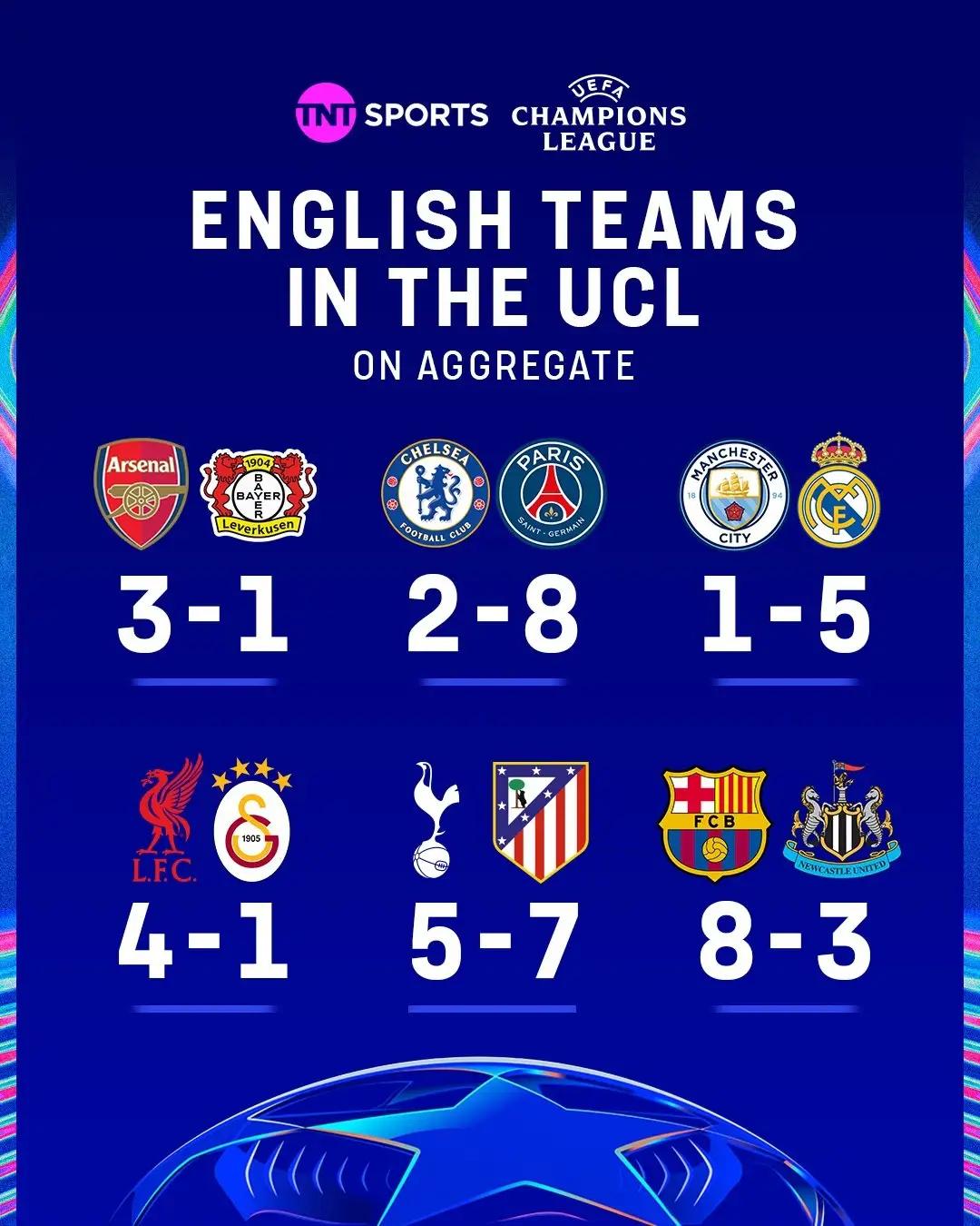欧洲三大杯1/8决赛踢完之后,9支参加比赛的英超球队,有5支打入了八强。输球的四支球队都在欧冠:切尔西、曼城、热刺和纽卡,现在英超几乎可以提前锁定下赛季5支欧冠参赛名额了。如果维拉或者森林拿到欧联杯冠军,他们又都没有进入英超前五,那英超下赛季又是6队踢欧冠。