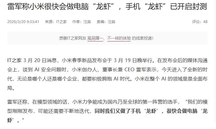 雷军称小米将推出电脑版龙虾 在昨天的小米发布会上,雷军聊到了“AI时代”这个话题。期间雷军表示:“我们的模型刚刚发布,可能还需要不断地迭代,同时我们又做了手机‘龙虾’,很快会做电脑‘龙虾’。” 值得一提的是,在3月份小米曾开启Xiaomi miclaw 的封测用户申请。