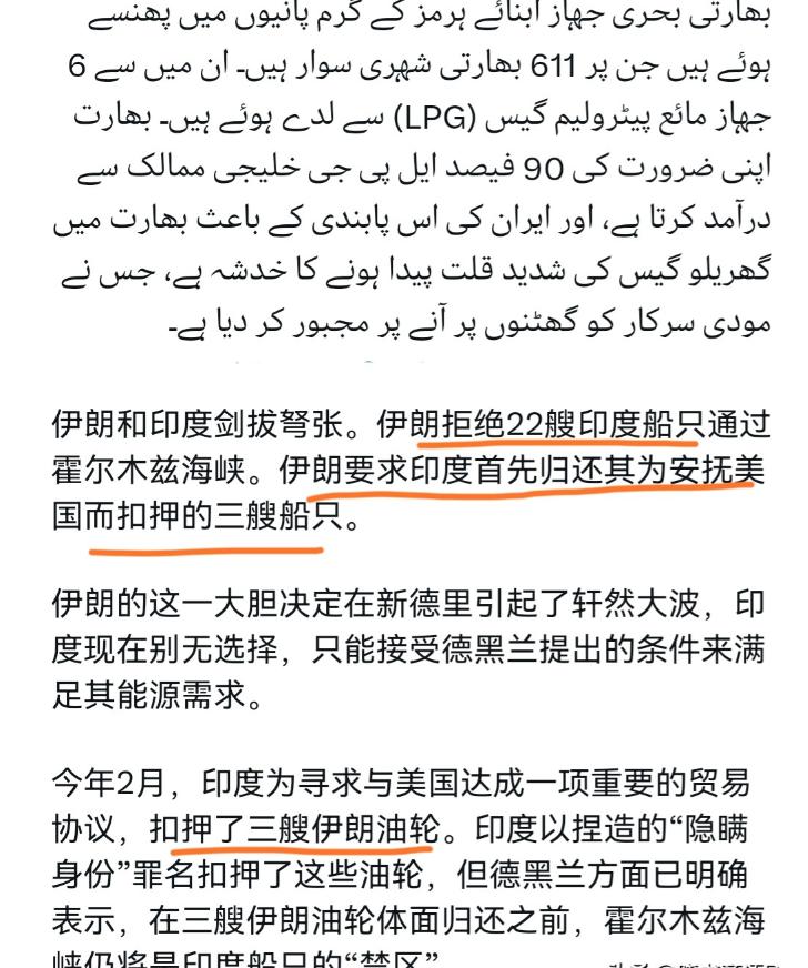 伊朗跟印度关系剑拔弩张了!外媒报道称,伊朗已经拒绝 22 艘印度船只通过霍尔木兹海峡的请求! 伊朗这次是直接硬刚,一点情面都没给印度留。 22 艘印度船被拦在海峡,船上 600 多名印度船员被困,动弹不得。 其中 6 艘还装着液化石油气,印度九成液化气都靠海湾进口,这下直接被掐住脖子。 这事起因很简单,今年 2 月印度为了跟美国谈贸易,主动扣押了 3 艘伊朗油轮。 印度说船只改了身份违规转运,转头就向美国示好。 伊朗现在直接对等反击,不放行印度船只,还要求印度先归还被扣油轮。 印度平时总爱左右逢源,谁都想讨好。 一边想靠美国捞好处,一边又离不开中东的能源。 这次算是踢到铁板,两头没捞着,还把自己坑惨了。 网友也都说,印度做事太投机,见风使舵没底线。 出来混迟早要还,这次被伊朗拿捏,也是自找的。 国际交往讲的是诚信,只顾自己利益耍小聪明,早晚要吃大亏。 对此你怎么看?