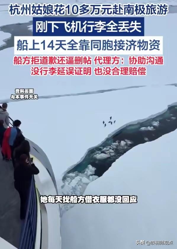 女子花10多万去南极,刚下飞机行李没了!船方甩锅、代理隐身,14天全靠同胞接济】 2月13日,杭州陆女士通过“企鹅环游”预订的南极之旅,刚抵达乌斯怀亚机场就发现行李丢失。船方仅将其带到柜台备案后便带其他乘客离开,未提供任何帮助。登船后,陆女士多次求助借御寒装备均无回应,靠同胞接济才撑过14天。 维权路上,船方将责任推给航空公司,代理方称“只负责协助沟通”。更惊人的是,“企鹅环游”国内公司已于2025年12月注销,注册地为虚拟地址。律师指出,该代理已与陆女士构成事实合同关系,不能免责。 截至今日,陆女士的三个诉求——正式道歉、行李延误证明、合理赔偿——无一满足。航司承诺的1200美元未到账,代理的800美元她拒绝。 唤羽师简评: 南极很美,但维权很冷。出发前请记住:合同是护身符,证据是子弹,别等丢行李了才想起找律师。那些靠收割“南极梦”发财的公司,良心何在?南极旅游感想 南极故事 南极旅行避坑 南极半岛旅游 南极旅行禁忌 穷游南极 南极半岛旅行 五万去南极 天价南极游 明星去南极 南极游价格 南极邮轮折扣 包机北极 飞南极不晕船 南极游套票