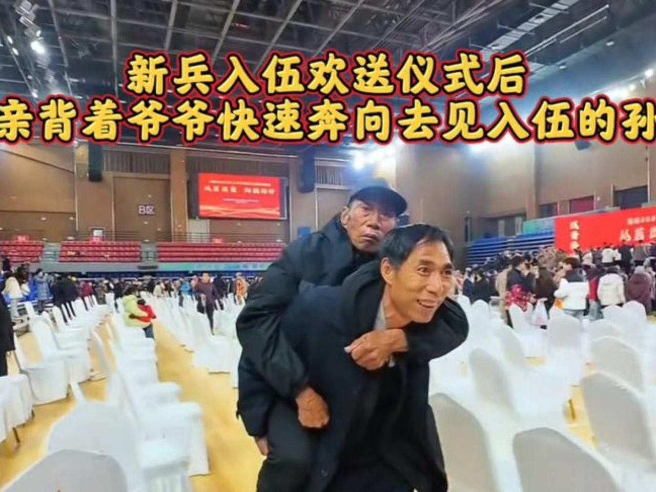 山东莒县新兵送别现场,一背一跑尽显家国深情。 (个人观点仅供参考,无任何不良引导) 3月18日的日照莒县,热闹的新兵欢送仪式洋溢着青春朝气。年迈老者行动不便难抵送别现场。中年男子俯身背起老父亲奋力向前奔跑。坚实的脚步跨越人群。只为让长辈亲眼见证孙儿入伍的光荣时刻。老者凝视身着戎装的晚辈。眼眸翻涌不舍情愫。心底升腾自豪荣光。抬手轻抹眼角泪珠。无声的牵挂诉说最深的疼爱。奔跑的身影承载孝道传承。挺立的身姿肩负家国使命。三代人的情感交织成最动人的画面。家国天下藏于平凡举动。孝心担当写在寻常瞬间。这样的传承最是动人。这样的情怀最值敬仰。