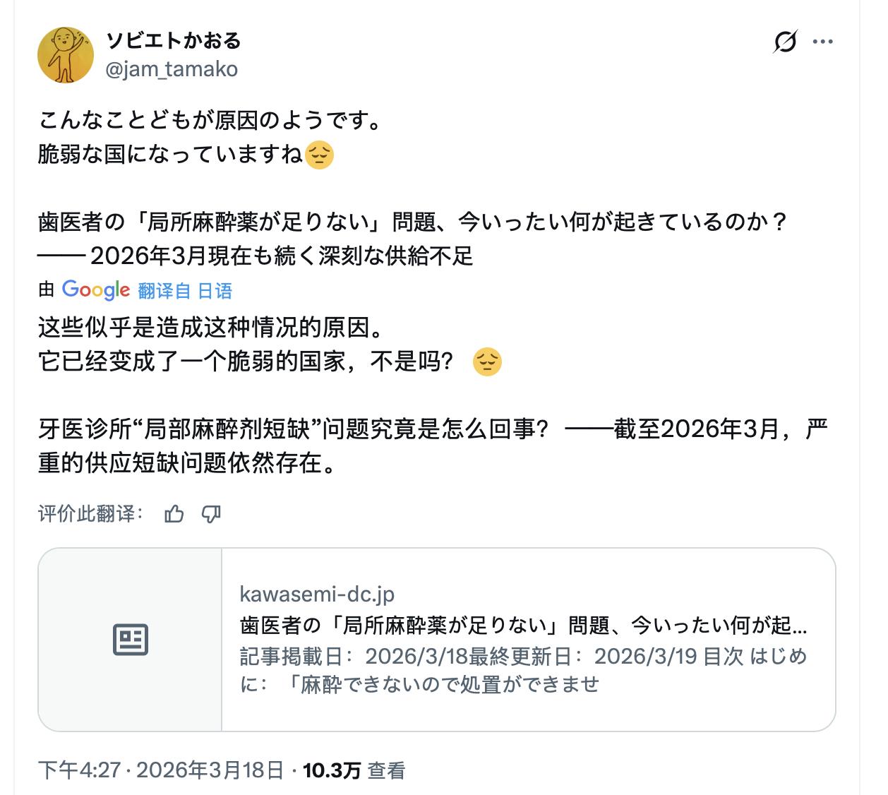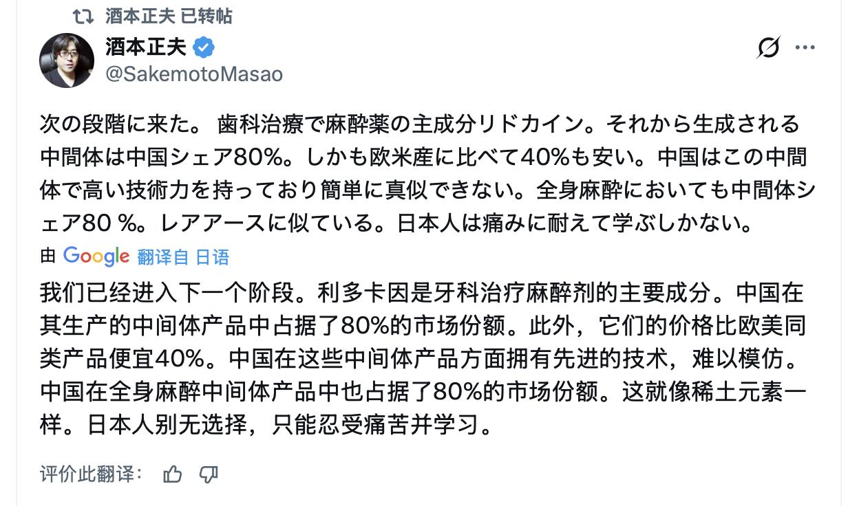 中国对日的出口管制已经见效,日本人开始出现牙痛了。 由于牙科麻醉剂的短缺,日本人看牙医只能忍着。 利多卡因是牙科治疗麻醉剂的主要成分,中国在其生产的中间体产品中占据了80%的市场份额, 此外,它们的价格比欧美同类产品便宜40%。