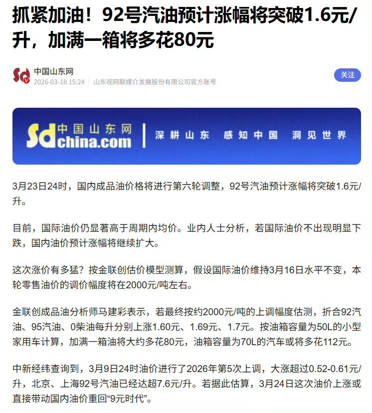 3月23日24时,油价又要调整!92号汽油预计大涨超1块6,直接重回9元时代!油