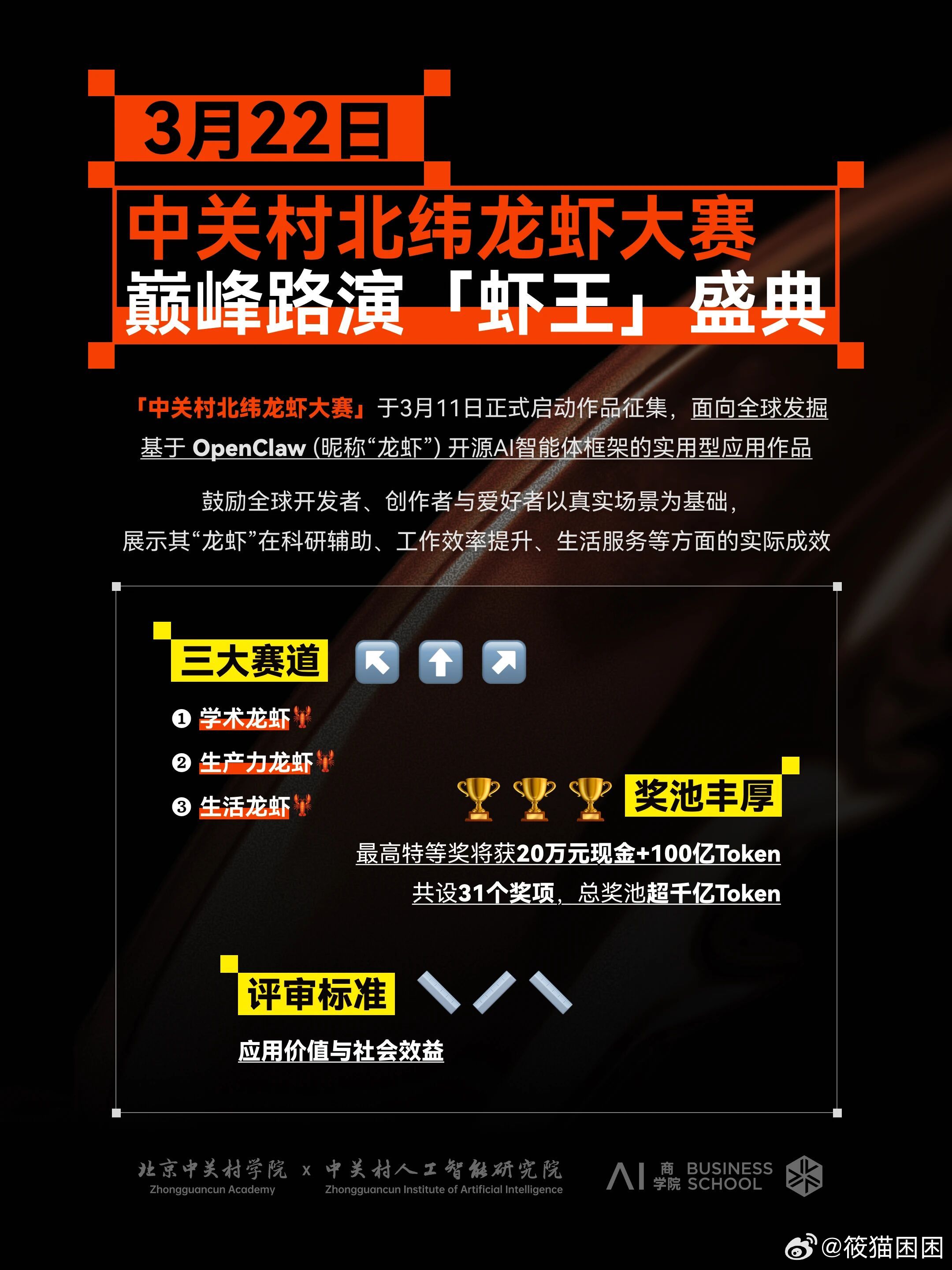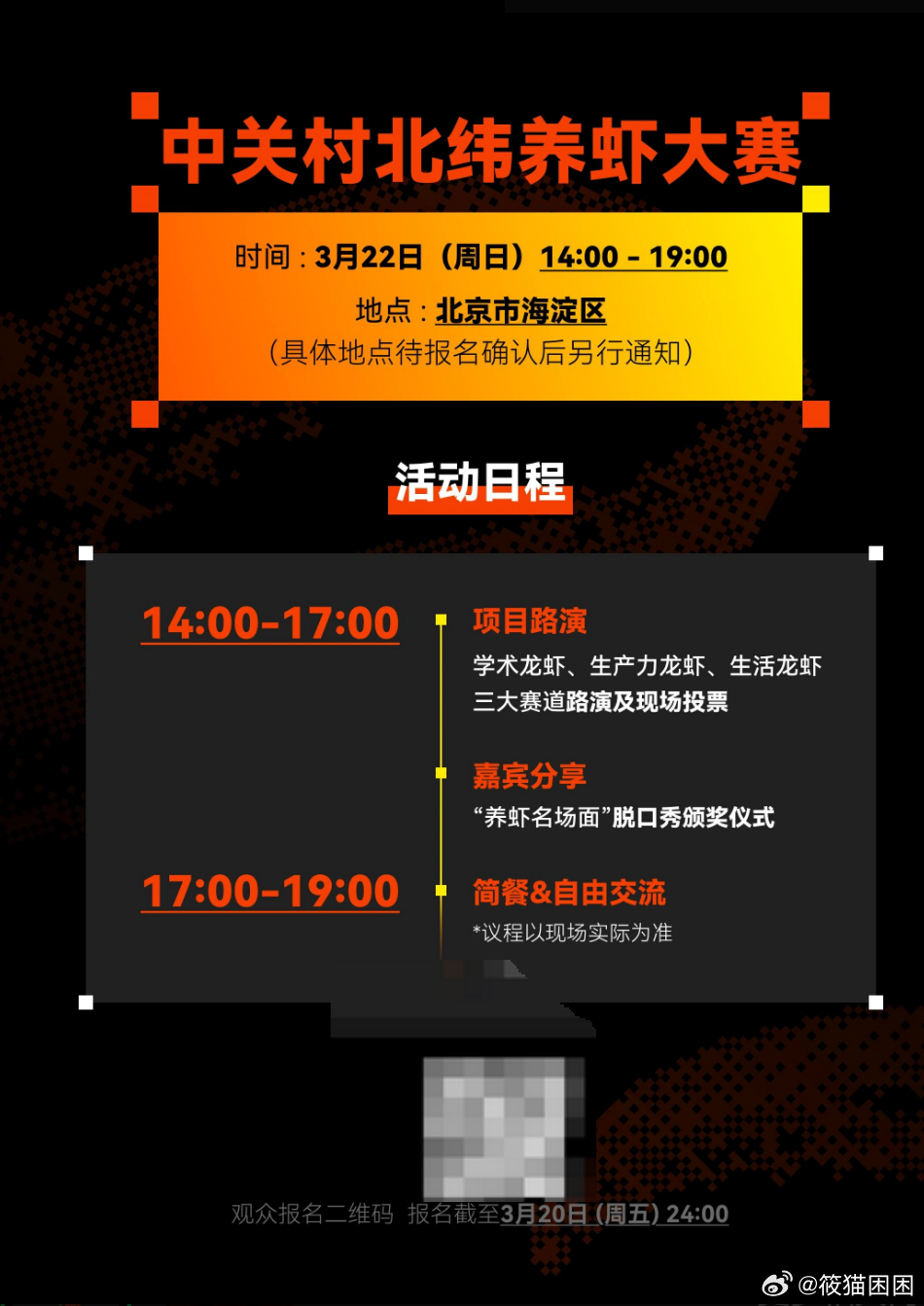 北京养虾天花板在此!3.22中关村北纬龙虾大赛决赛线下见真章~虾王诞生+虾友交流会+专家点评,干货多到记不过来!公众号预约通道→“北京中关村学院”中关村北纬龙虾大赛沉浸式体验北京养虾大赛