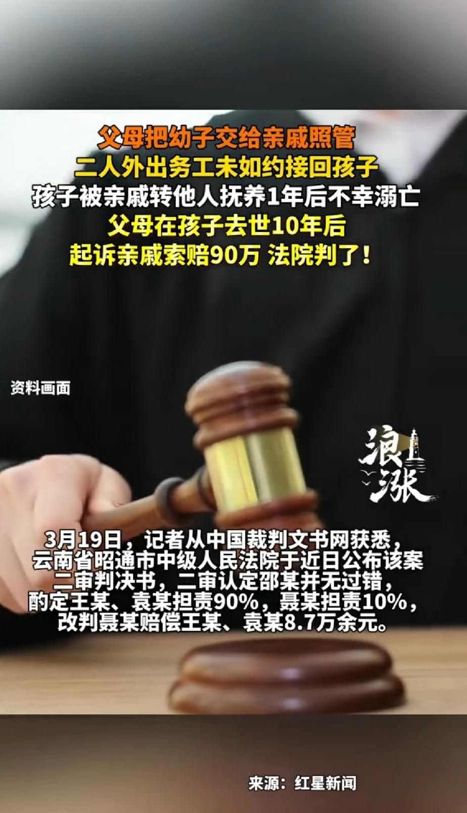 父母把幼子交给亲戚照管,二人外出务工未如约接回孩子,孩子被亲戚转他人抚养一年后不幸溺亡。父母在孩子去世10年后起诉亲戚索赔90万赔偿。法院判了! 王某和袁某把一岁幼子小袁交给亲戚邵某照管后外出务工,却没按约定接回孩子。邵某督促后,他们仍没带走,再次外出。之后邵某把孩子委托给聂某抚养,结果孩子不幸溺亡。 这对不靠谱的父母,碰到糊涂的亲戚,帮别人带孩子要担很大责任,更何况约定的时间到了,父母也不把孩子接回去,生了不养,生他干嘛,难道只是用来索赔的工具。也好意思起诉亲戚索赔90万!孩子的死亡还是亲生父母占主要责任。 孩子去世10年后,父母才回来索赔90多万。一审法院让王某、袁某担80%责任,邵某和聂某担20%。二审又改判,认定邵某无过错,王某、袁某担90%,聂某担10%,赔8.7万余元。这父母心也太大了,孩子出事10年才想起维权,自己责任肯定不小啊。