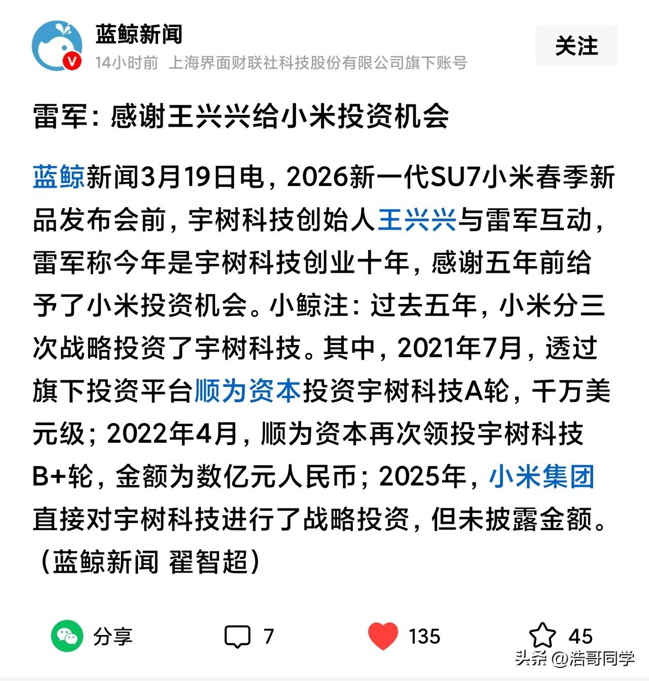 原来宇树科技是小米集团投资的! 就在昨天新一代小米SU7发布会前,宇树科技的王兴兴达到现场,向金主雷总展示宇树科技生产的机器人,这个机器人可不得了,连续两年登上央视春晚的舞台现场,原来这么厉害的机器人是小米集团五年前投资的一个项目。 在发布会的现场,雷总还特意邀请了除了王兴兴在内的比亚迪王传福、理想的李想、小鹏的何小鹏亲临现场,不过,有眼尖的同学发现蔚来的李斌缺席了这次的发布会,可能李斌的档期冲突来不了吧! 大家别忘了,咱们小米的雷总可是天使投资人,他投资的很多项目现在都赚的盆满钵满。未来,小米会在机器人和AI领域持续发力,将这些领域的技术投放到小米智能汽车上面,今后小米汽车会越来越智能。 机器人宇树科技 宇树机器人公司 宇树机器人测评 小米su7 小米YU7雷军 宇树H2机器人 宇树机器人工厂 宇树科技春晚