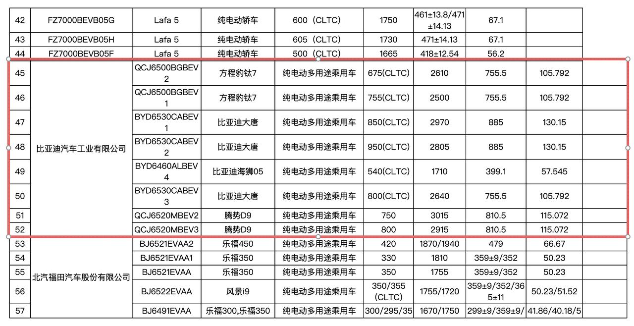 最新的工信部申报数据整理好了,这几款热门车型信息速看: -腾势D9 115.072 kWh 版本,整备质量 2915/3015kg,纯电续航 750/800km -问界M6 EV 97.644 kWh 版本,整备质量 2395/2460/2515/2565kg,纯电续航 760/715/705/665km -魏牌V9X(插混) 53.6 kWh 版本,整备质量 2740/2780kg,纯电续航 240km 77.7 kWh 版本,整备质量 2890/2930kg,纯电续航 363km -零跑D19 99.6 kWh 版本,整备质量 2730kg,纯电续航 620km -理想L9(插混) 72.7 kWh 版本,整备质量 2755/2785/2810/2835kg,纯电续航 340/332km -小米YU7 101.7 kWh 版本,整备质量 2460kg,纯电续航 705/650km -比亚迪大唐 130.15 kWh 版本,整备质量 2970/2805kg,纯电续航 850/950km 105.792 kWh 版本,整备质量 2640kg,纯电续航 800km -小鹏GX 91.9 kWh 版本,整备质量 2690/2750kg,纯电续航 665/635km 110 kWh 版本,整备质量 2785/2820kg,纯电续航 750/720km 63.3 kWh 版本,整备质量 2840/2890kg,纯电续航 320km(增程)【来自懂车帝车友圈】