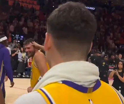 赛后,东契奇被所有湖人队员包围,队友们纷纷过去拍头祝贺东契奇的里程碑时刻。
