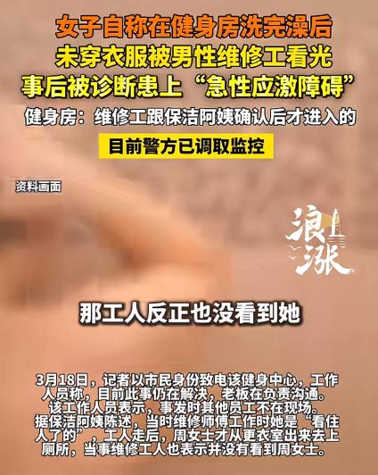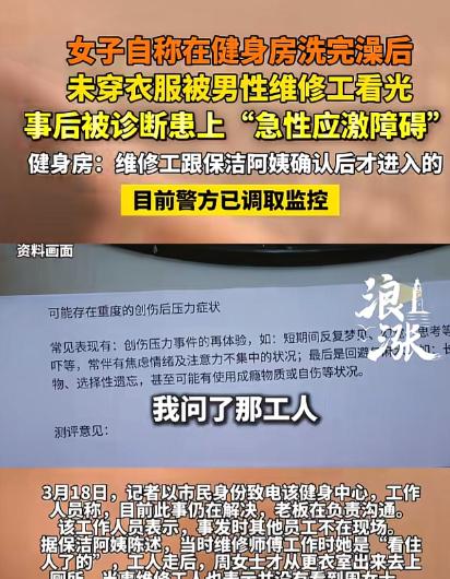 浙江嘉兴,女子在健身房运动完,冲了个澡,接着,一丝不挂的前往女厕所。谁知,里面竟然有一位男维修工,四目相对,女子直接被看光,女子又羞又怕,当晚回到家就不好了。次日,找到健身房讨要说法。 没想到,健身房只给出,全额退还1980元办卡费,或帮女子延长3个月的会员两种补偿方案,女子当场拒绝了。事后,女子被诊断患了急性应激障碍,她坚决要求维修工道歉,并要求健身房给予精神赔偿。没想到,健身房却给出完全了不同的说法,女子傻眼了! - 阅读前请点个赞,点个关注,主页有更多你喜欢看的内容 - 周女士手里那张诊断书写着急性应激障碍,这几个字的分量远比一张1980元的退费单重得多,原本一次很普通的健身和洗澡,最后却变成了她连续失眠心慌手抖的开始, 地点在浙江嘉兴的一个傍晚,她健身完洗了澡还没穿上衣服,只用毛巾裹着就去女厕所隔间,刚把门推开就看见一个男维修工站在对面还拿着工具,两人当场毫无遮挡地正面撞了个照面, 那一瞬间带来的冲击她后来都说不清楚,她是怎么跑回更衣室的自己都记不太全,真正的后劲是在当天夜里爆出来的她完全睡不着,脑子里反复回放那个画面怎么压都压不下去, 第二天她和家人去健身房讨说法,店里只给两种处理,退她1980元办卡钱,或送三个月会员当补偿,他们以为这样就能了事,但她直接拒绝,因为她要的是维修工当面道歉,并给精神损失赔偿, 健身房马上改口说,维修工进去前已让保洁确认女厕没人,干活时保洁一直守在门口,是周女士自己从更衣室走进去的,维修工也说他埋头施工没留意有人进来, 这种表述的意思很明显就是把责任往周女士身上推,从我们有失误变成你自己闯进来,问题是高峰营业时间女更衣区和女厕连在一起只靠一个保洁站门口就算防护到位吗, 更关键的是从更衣室到女厕之间有没有清楚的告示和硬隔断提示维修中勿入,保洁的视线能不能覆盖所有入口和盲区,现场如果什么提示都没有那顾客正常走过去就很难被叫作闯入, 健身房还补充说平时高峰期不会安排异性维修这次是特殊情况,这句话等于承认他们知道风险也知道敏感但还是做了,出了事之后再拿特殊情况当理由显得更像推脱, 周女士后来去医院做了检查和评估,结果写得很清楚是急性应激障碍并且存在明显创伤后反应,比如注意力涣散反复闯入性联想社交受影响,这些都不是情绪化夸大而是白纸黑字的医学结论, 隐私空间里被陌生异性突然直视带来的失控感不是尴尬一下就过去,它会在之后的很长时间里持续发酵让人反复想起并产生回避和恐惧,所以1980元和三个月会员根本换不回她推门前那一秒的安全感, 目前警方已经介入并调取健身房内部监控录像,大家都在等监控说话因为它能回答保洁是否真的一直守门周女士是正常进入还是被明确拦过维修工是否真的完全没注意等关键点, 当然监控也有局限拍摄角度和时长会决定它能还原多少细节,但不管最后画面如何有一件事已经成立,营业高峰期女性私密区域出现男性维修人员而且让女性顾客因此受伤这本身就是管理漏洞, 所谓保洁把关在那一刻已经失效,因为只要有几十秒空档或提示不到位就足以让事故发生,经营健身房不只是让设备运转更要保证女更衣室女厕所这类空间给用户最基本的安全感, 这种场景如果必须维修就该选非营业时间或者安排女性维修人员或者做硬隔断并放置醒目告示,缺任何一项都可能把风险转嫁给顾客用一个保洁站门口去守住女性尊严本来就像走钢丝, 健身房现在说配合调查等结果出来再谈听着冷静其实就是在等监控能不能替自己减轻责任,而周女士在等的不只是结果更是一个能让她安心的说法,那张诊断书压在她手里沉甸甸地提醒她1980元真的太轻了。