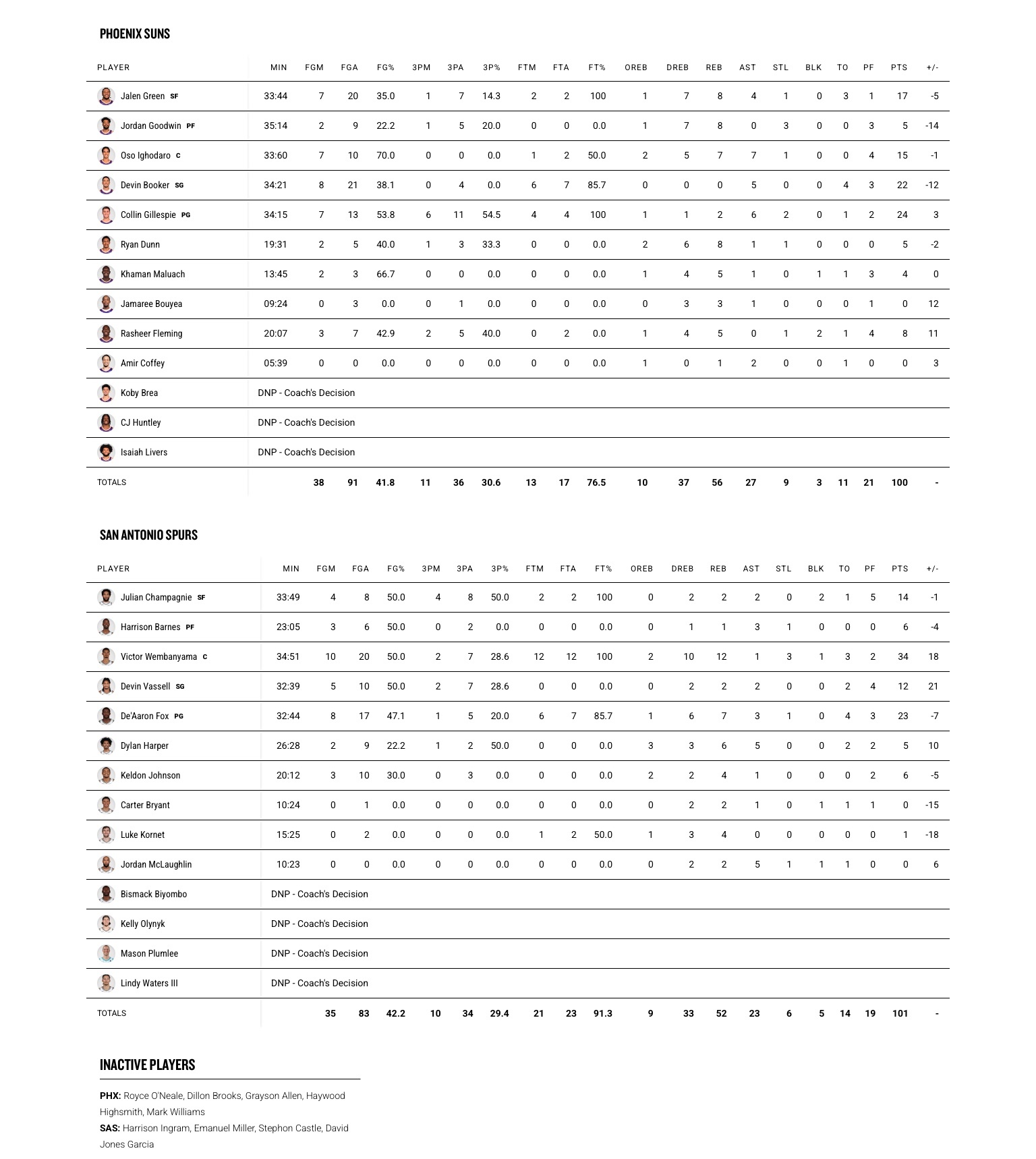 马刺(52-18):文班亚马34分12板1助3断、福克斯23分7板3助、尚帕尼14分2板2助2帽、瓦塞尔12分2板2助、凯尔登6分4板1助、巴恩斯6分1板3助、哈珀5分6板5助、科内特1分4板、麦克劳林2板5助、布莱恩特2板1助