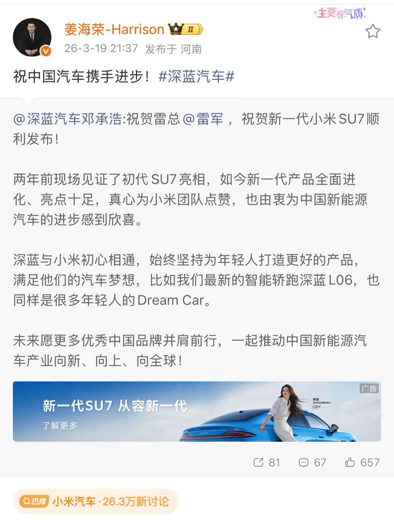 深蓝董事长祝贺小米SU7发布深蓝邓总祝贺小米新SU7发布,大格局,大家一起努力,