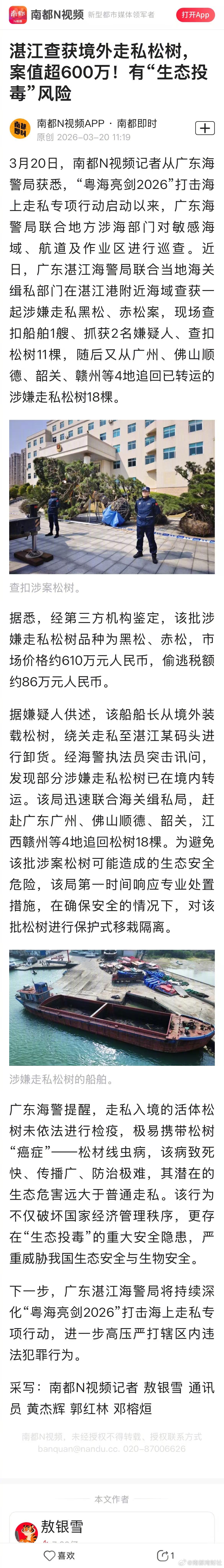 【#湛江查获境外走私松树29棵#,案值超600万!有“生态投毒”风险】#走私松树有生态投毒风险#3月20日,南都N视频记者从广东海警局获悉,“粤海亮剑2026”打击海上走私专项行动启动以来,广东海警局联合地方涉海部门对敏感海域、航道及作业区进行巡查。近日,广东湛江海警局联合当地海关缉私部门在湛江港附近海域查获一起涉嫌走私黑松、赤松案,现场查扣船舶1艘、抓获2名嫌疑人、查扣松树11棵,随后又从广州、佛山顺德、韶关、赣州等4地追回已转运的涉嫌走私松树18棵。