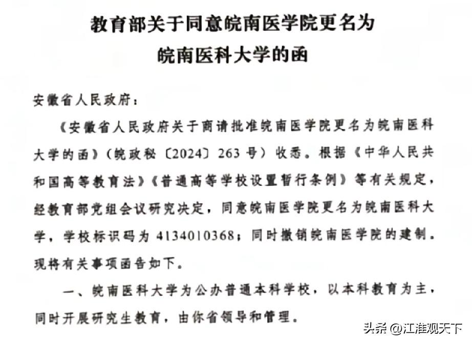 恭喜芜湖市,皖南医科大学正式挂牌,芜湖高等教育的大喜事 2026年3月5号,批复皖南医学院更名为皖南医科大学的函正式下发到安徽省。 3月19号,皖南医科大学正式更换校名,皖南医学院的历史使命已经结束,皖南医科大学从此开启新的征程。 皖南医科大学地处安徽省芜湖市,主校区是滨江校区,另外还有赭麓校区,银湖校区。 皖南医科大学的挂牌,对于芜湖市高等教育界来说是大好事,学院改名为大学,未来皖南医科大学的办学经费,师资力量,学科设置,各种软硬件条件都会有大的提升。皖南医学院复试 安徽医科大学生